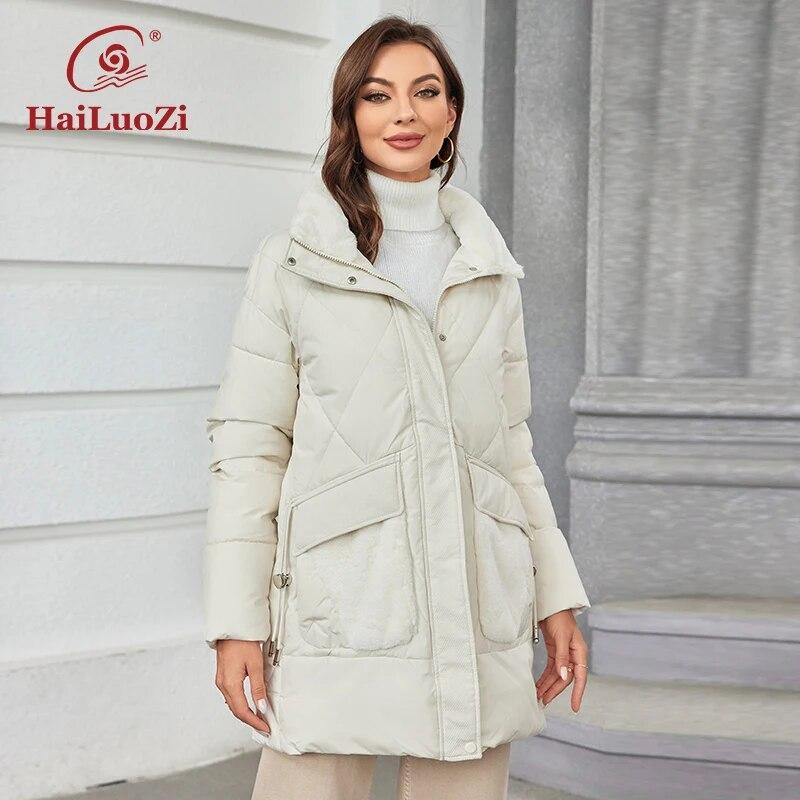 HaiLuoZi 2023 Новая женская зимняя куртка, короткая теплая женская верхняя одежда с капюшоном и боковыми карманами на меху, однотонное женское пальто 1155