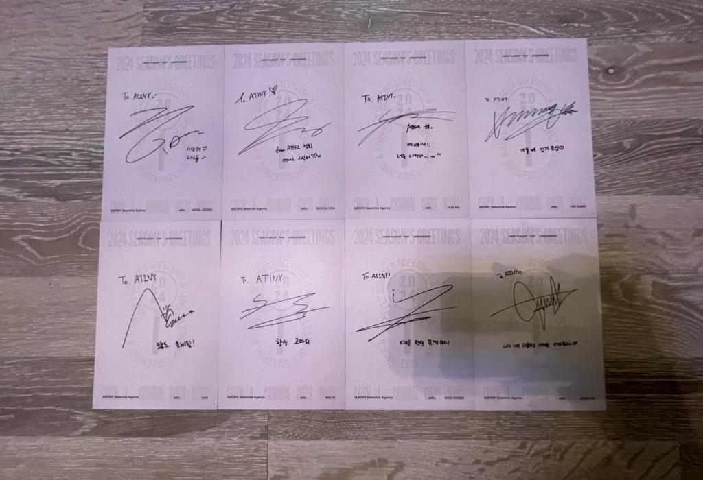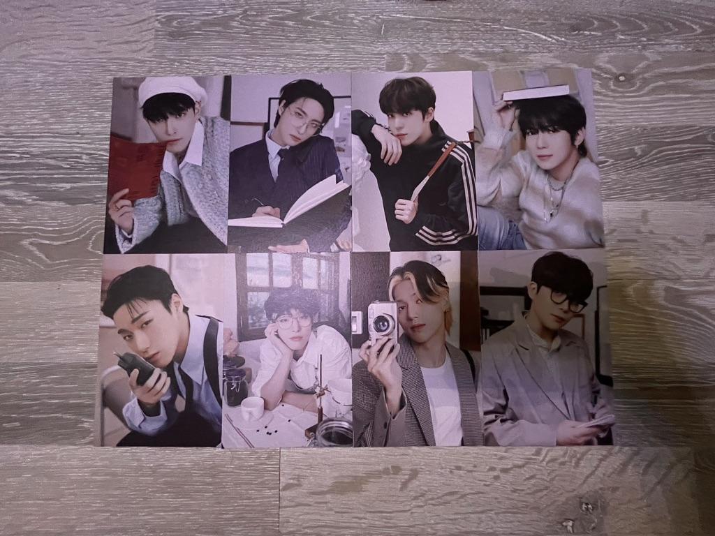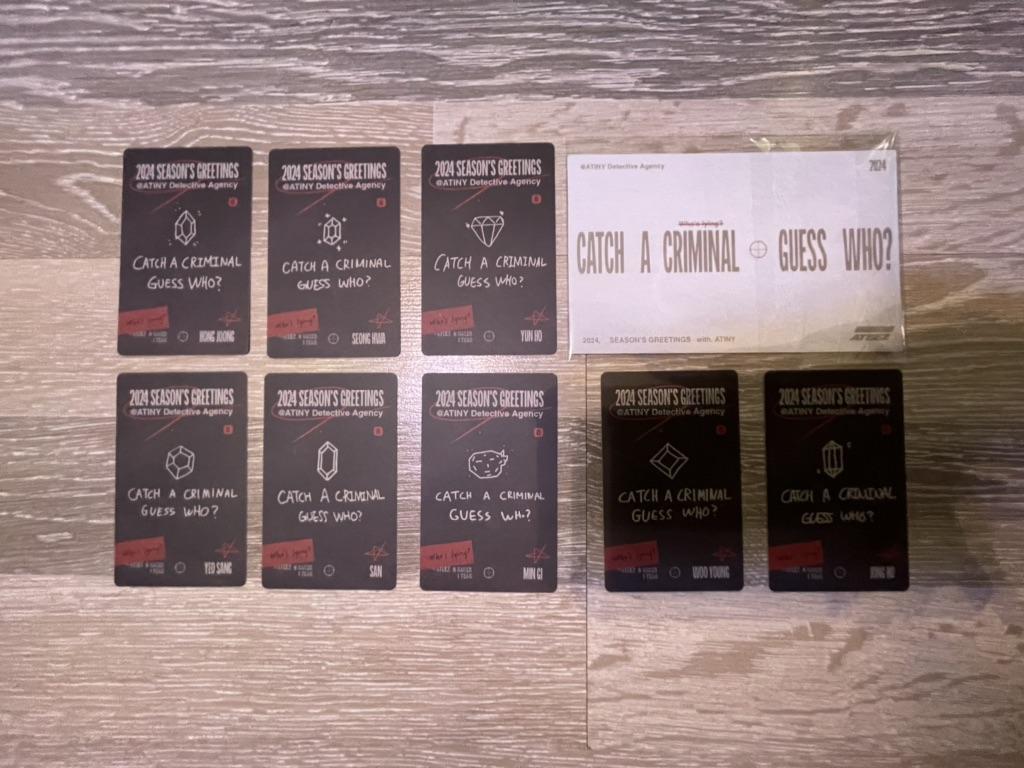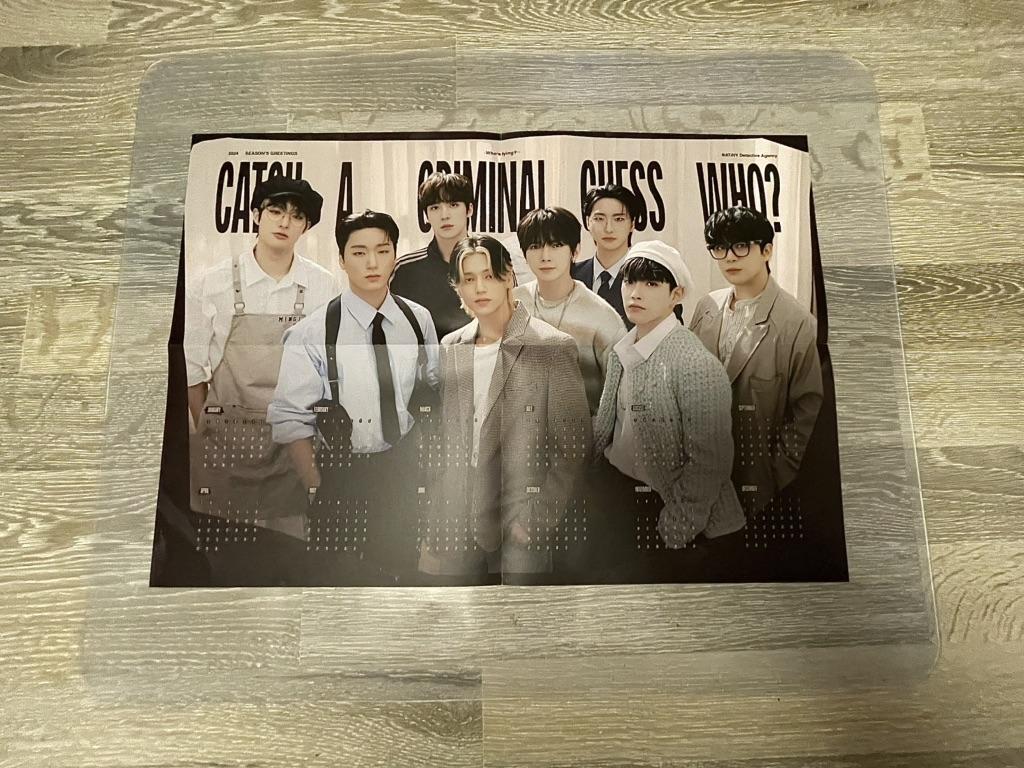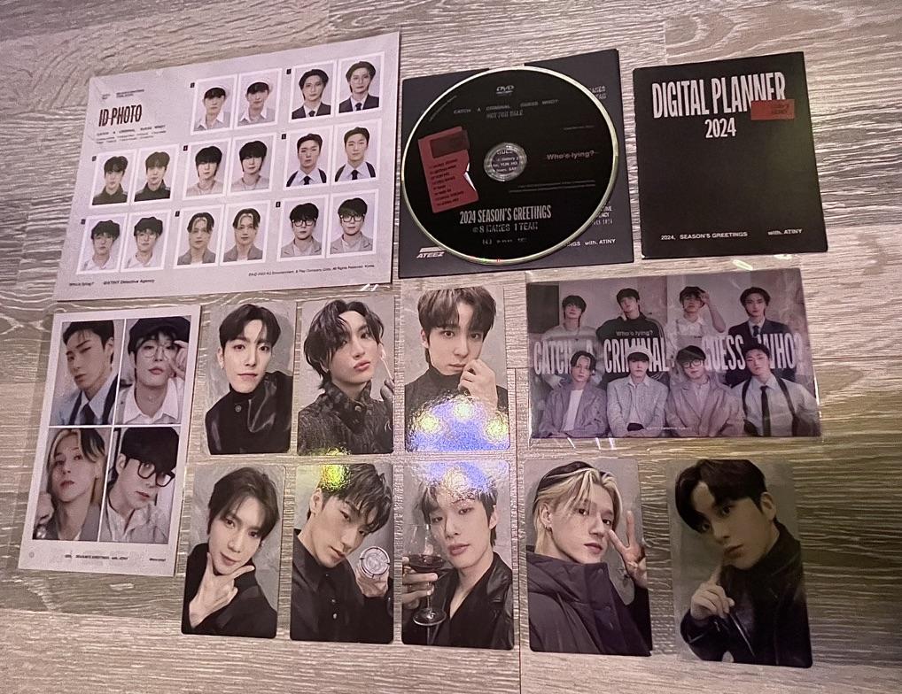• заказ был сделан 31 декабря, отправили его 5 января из Кореи (Сеула). 9 января товар прибыл в Узбекистан, 15 января гриттинг прилетел в Россию (Москву). 19 января уже был в нужном почтовом отделении г. Обнинска. • упаковка – коробка + 2 слоя воздушно-пузырьковой плёнки. гритинг пришёл в идеальном состоянии. • содержимое гритинга: 1) коробка, в которой находится всё содержимое; 2) лист с айди фотографиями всех участников (по 2 на каждого); 3) диск (содержимое – как создавался гритинг); 4) большая общая лентикулярная карта; 5) набор/сет из 8 селфи-карт (выпадет один из двух, либо как мой, либо выпадет светлый набор с селфи-картами в стиле открыток на 3, 5 фотографиях); 6) буклет с QR-кодом для доступа к цифровому планеру ATEEZ; 7) 13 индивидуальных открыток (8 индивидуальных открыток с подписями участников сзади + 5 совместных); 8) книга планер-фотобук (первая часть книги – планер, вторая – фотобук с 2-мя фотосессиями, примеры обеих фотосессий на 6-7 фотографиях, планер-фотобук лежит слева); 9) настольный календарь (справа на 6-7 фотографиях, тоже с 2-мя фотосессиями); 10) плакат-календарь со всеми участниками. + так как был выбран вариант с Standard POB, гритинг пришёл с листами (один из них на первой фотографии в левом нижнем углу). это и есть 11) Standard POB.
