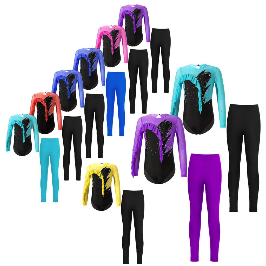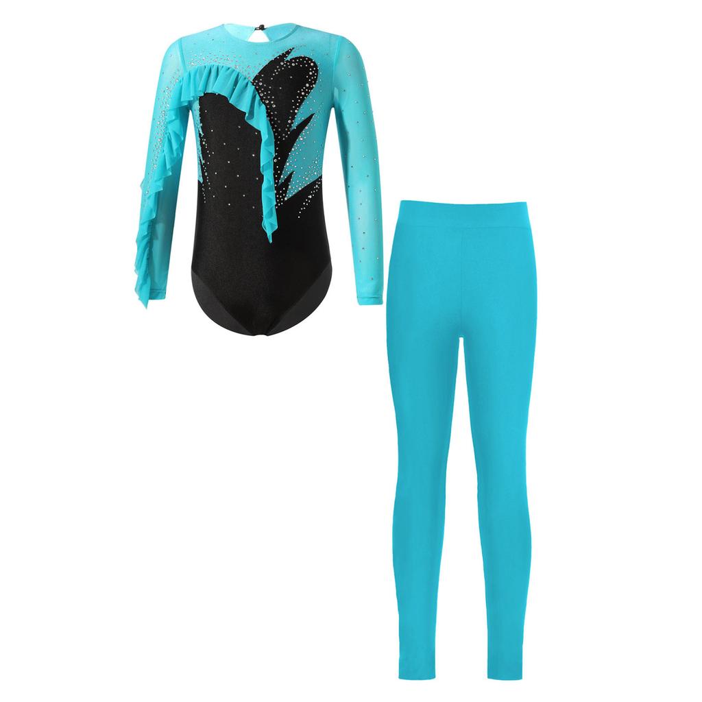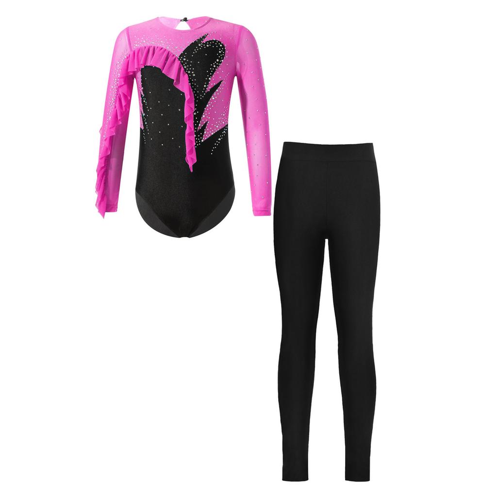 Детский гимнастический танцевальный наряд для девочек, купальник с блестящими стразами и длинными рукавами, декор с рюшами и леггинсами