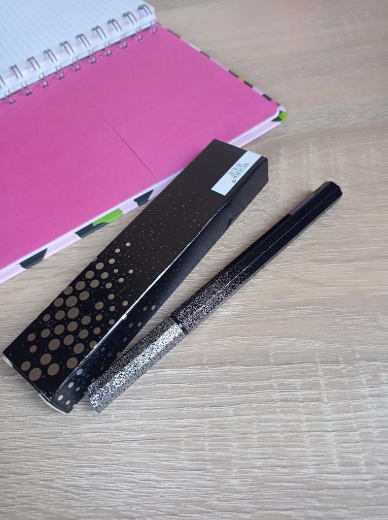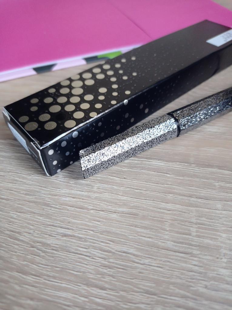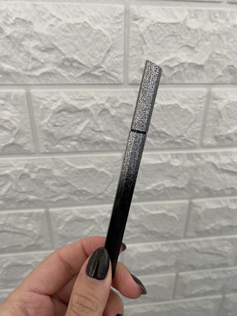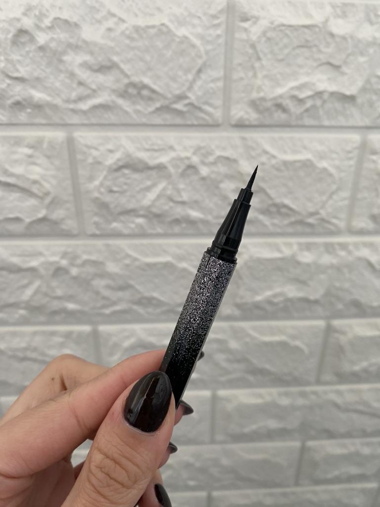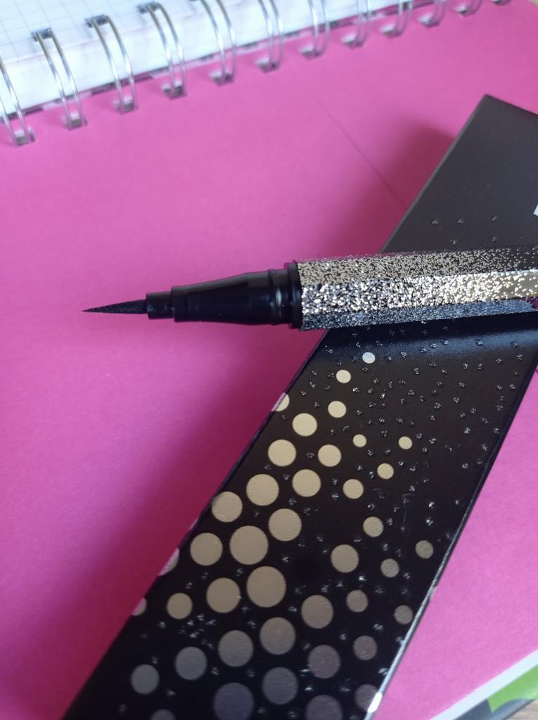 Лайнер Черный гранёный корпус. Немного блесток на корпусе. Сам лайнер в формате фломастера с фетровым наконечником. Кончик мягкий и упругий, тонкий, плавную линию провести не проблема. От обычной воды не растекается, снимается миццеляркой. Отличный. Присмотритесь.