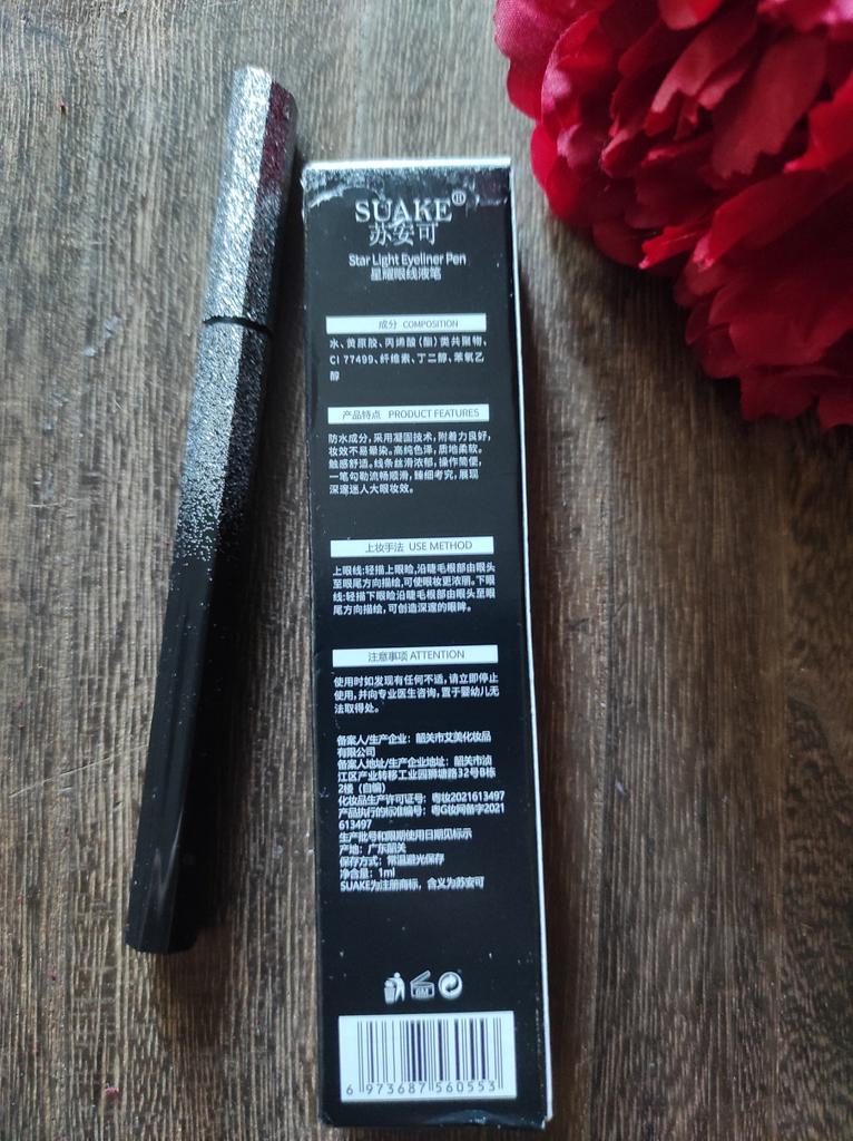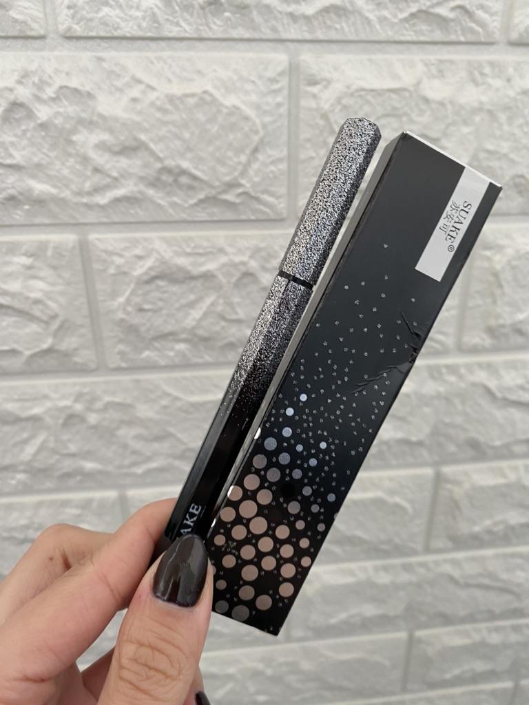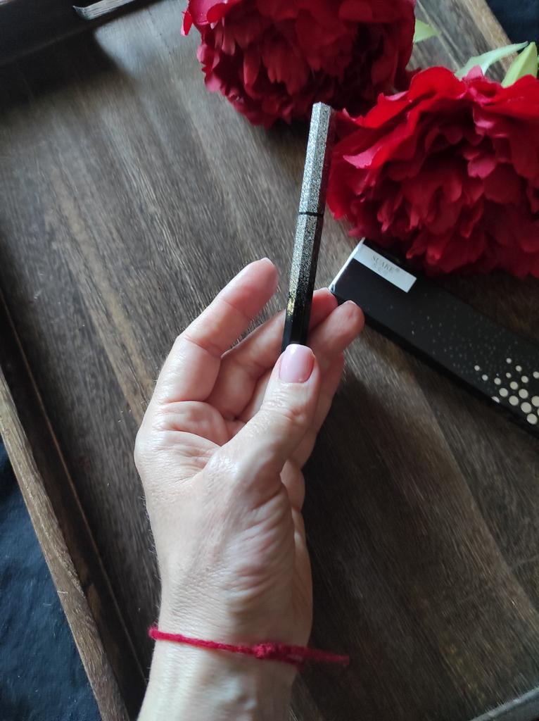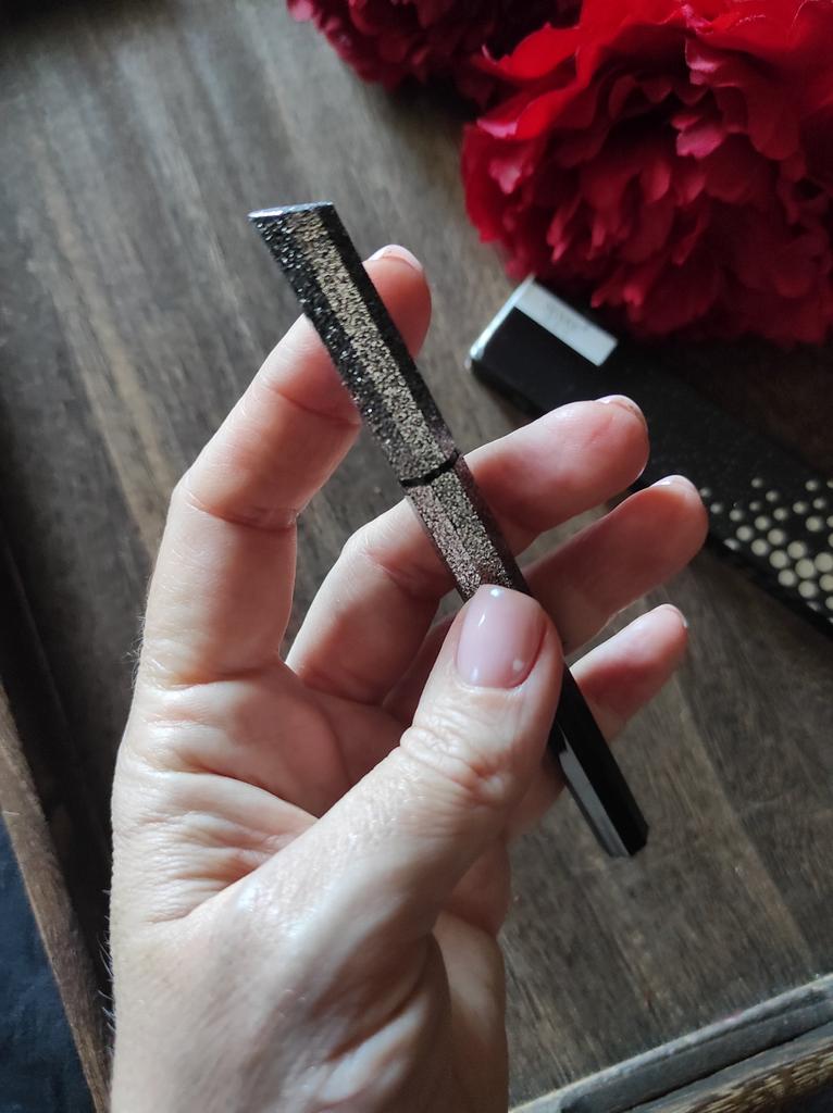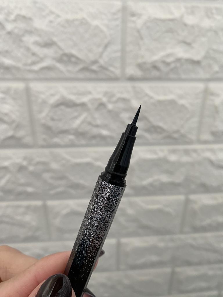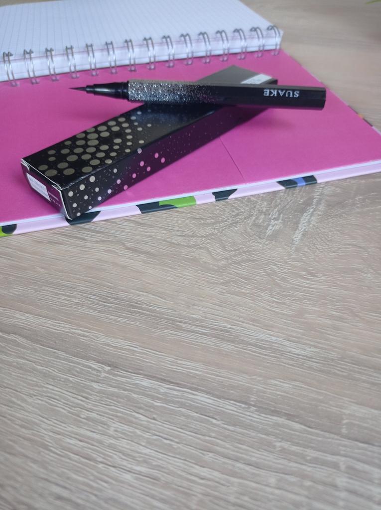 Лайнер Черный гранёный корпус. Немного блесток на корпусе. Сам лайнер в формате фломастера с фетровым наконечником. Кончик мягкий и упругий, тонкий, плавную линию провести не проблема. От обычной воды не растекается, снимается миццеляркой. Отличный. Присмотритесь.