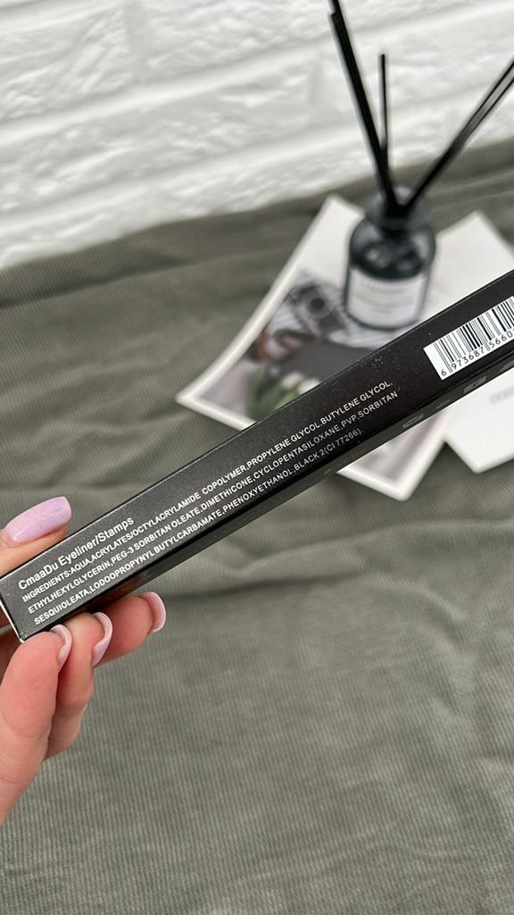 Лайнер с печатью Пришел в коробочке) На ней есть состав и остальная информация) Лайнер крутой-двусторонний. С одной стороны сам лайнер ,с другой - печать для стрелки. Печатью сложно подстроится для идеальной стрелки,но если очень постараться,то можно. Сам лайнер тонкий с длинным носиком) по центру он немного расширяется) Им удобно делать тонкие стрелки и потолще тоже) Пигментация лайнера - ярко черная! Насыщенный ,красивый черный цвет) Ложиться легко)Высыхает быстро) Он не растекается при смывании, а скатывается) По стойкости лайнер держиться день спокойно, может даже и больше выдержать) В целом лайнер отличный) Мне нравиться, пользуюсь с удовольствием) Доставка в Беларусь 3 недели)