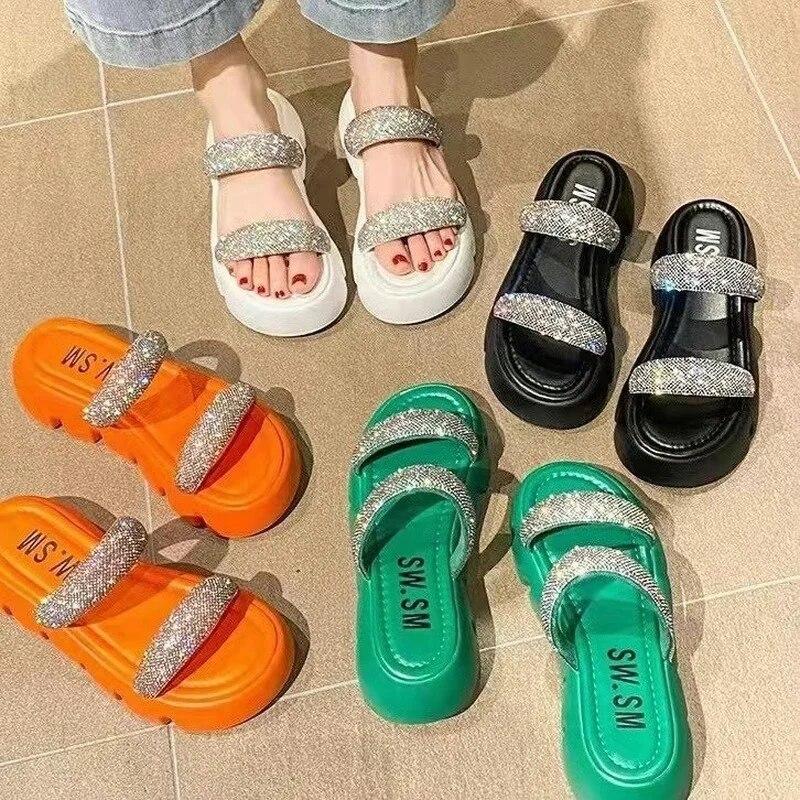 Новейшие уличные модные сандалии, женские непромокаемые туфли на платформе с толстой подошвой и стразами, летние пляжные сандалии ярких цветов