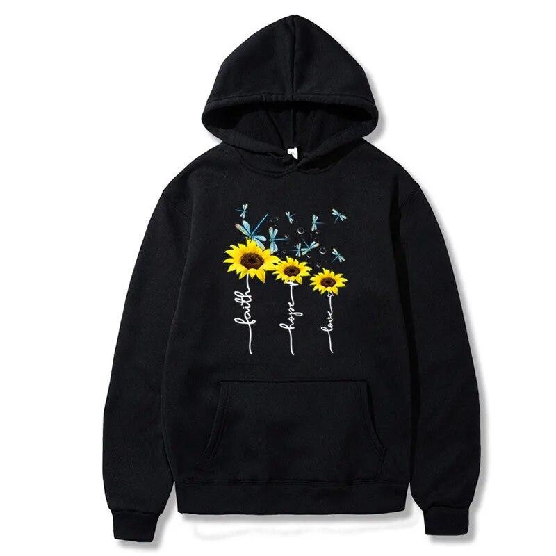 Модные толстовки с принтом подсолнуха и стрекозы, женские уличные толстовки с капюшоном, пуловер в стиле Харадзюку, спортивный костюм унисекс, одежда