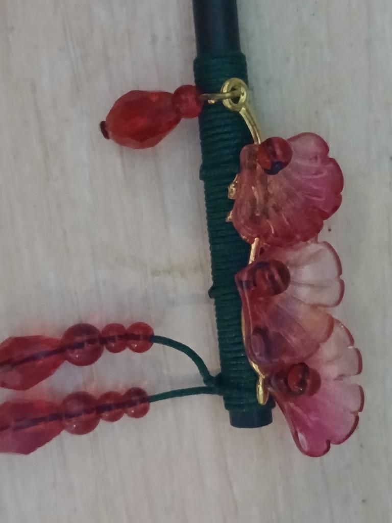 Заколка прям шикарная. В жизни она выглядит более насыщенная, чем на фотографиях. Палочка сама из дерева, но самое удивительное для меня стала это то, что цветочки именно пришиты со счёт той же нити, что и обмотано по самой палке, это очень красиво смотрится.