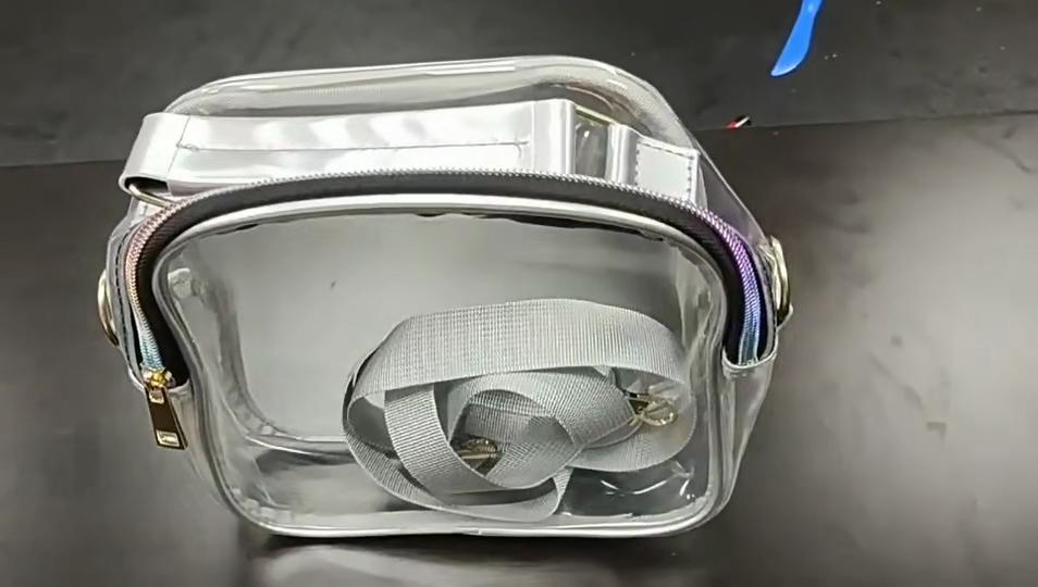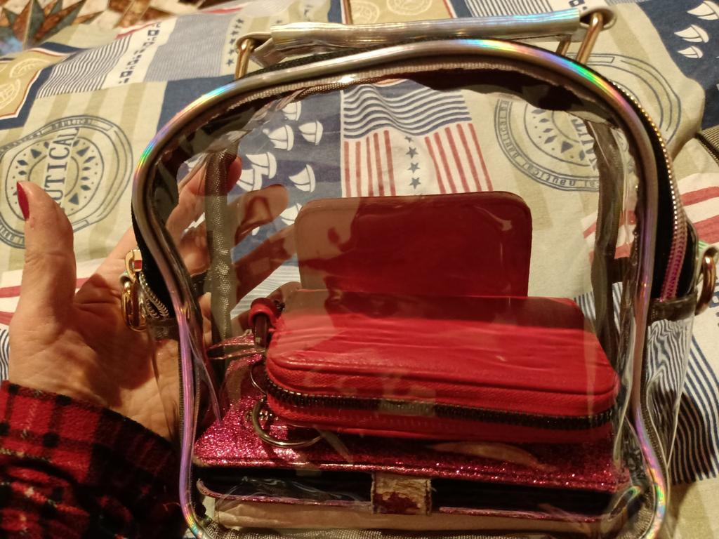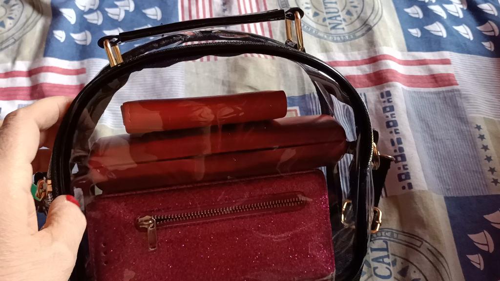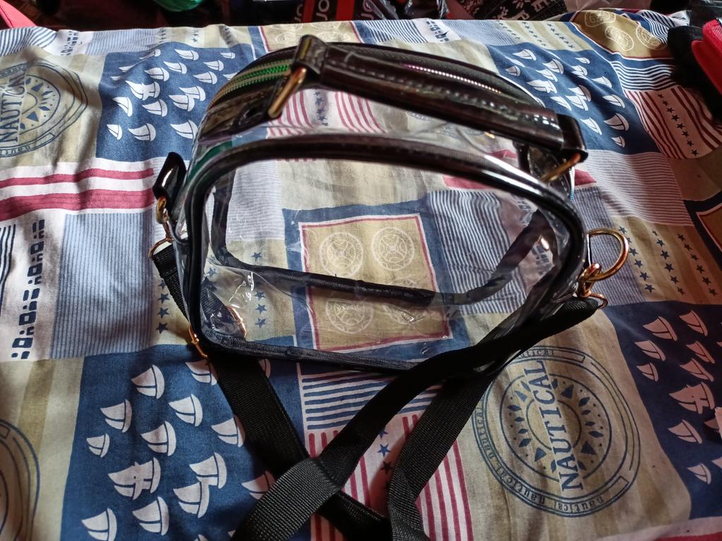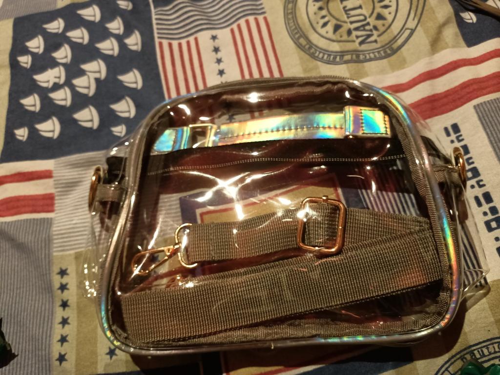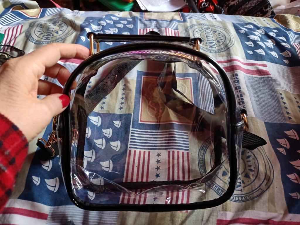 Получила классную прозрачную сумочку! Единственный недостаток , что очень плотный материал. А так все неплохо. Вместительная, много чего в ней поместилось: 2 телефона очки в футляре ключи, кошелек с картинками и ещё осталось место. Немного не понравился ремень. Наверное дозакажу чуть светлее. В целом очень понравилась. Продавец положил резиночку. Спасибо. Спасибо продавцу и нашему Джуму! Рекомендую!