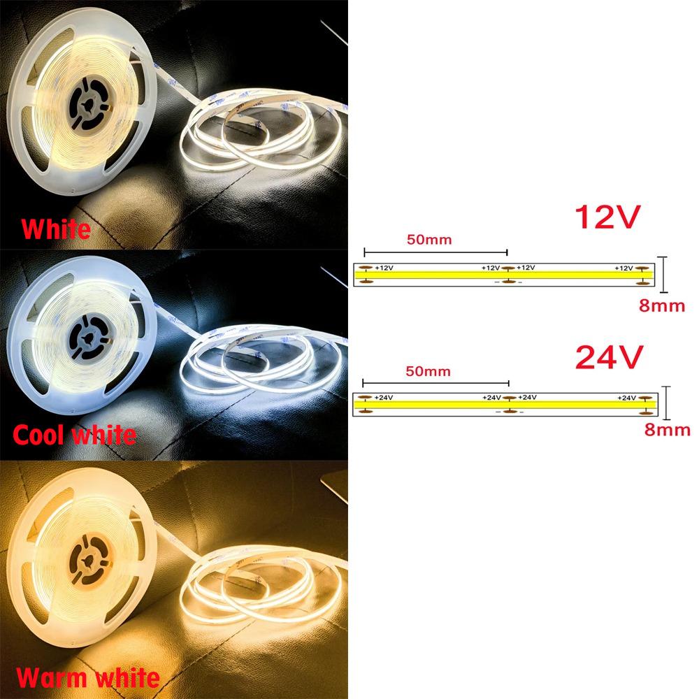 Светодиодная лента COB, ультратонкая лента 12 В, 24 В, 8 мм, с вилкой постоянного тока/2-контактным проводом, регулируемая линейная подсветка, украшение лампы высокой плотности