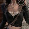 Французская девушка с v-образным вырезом, искусственная двухсекционная строчка, кружевной внутренний вязаный кардиган, футболка, женский короткий топ, осень