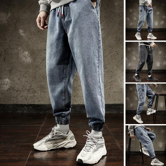 Эластичный пояс со средней посадкой, термоусадочные манжеты на шнурке, повседневные джинсы, мужские джинсы с несколькими карманами, джинсовые спортивные штаны в стиле хип-хоп, уличная одежда — купить товар онлайн с бесплатной доставкой до всему миру!
