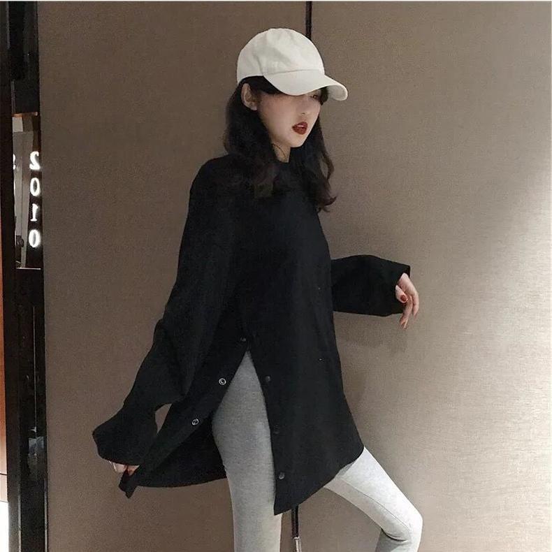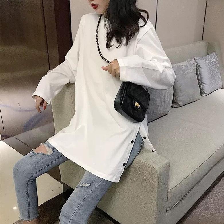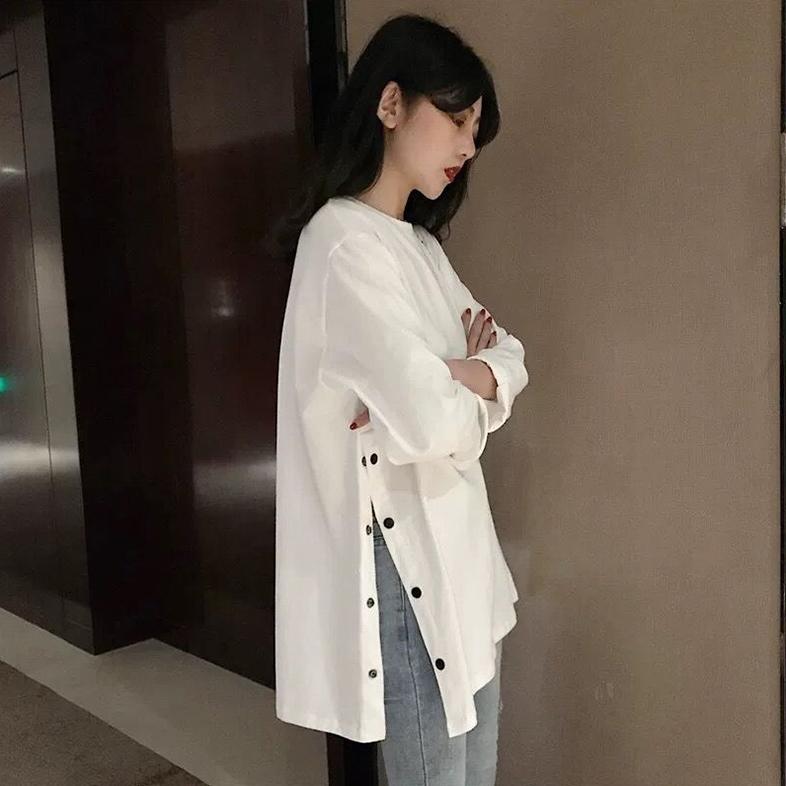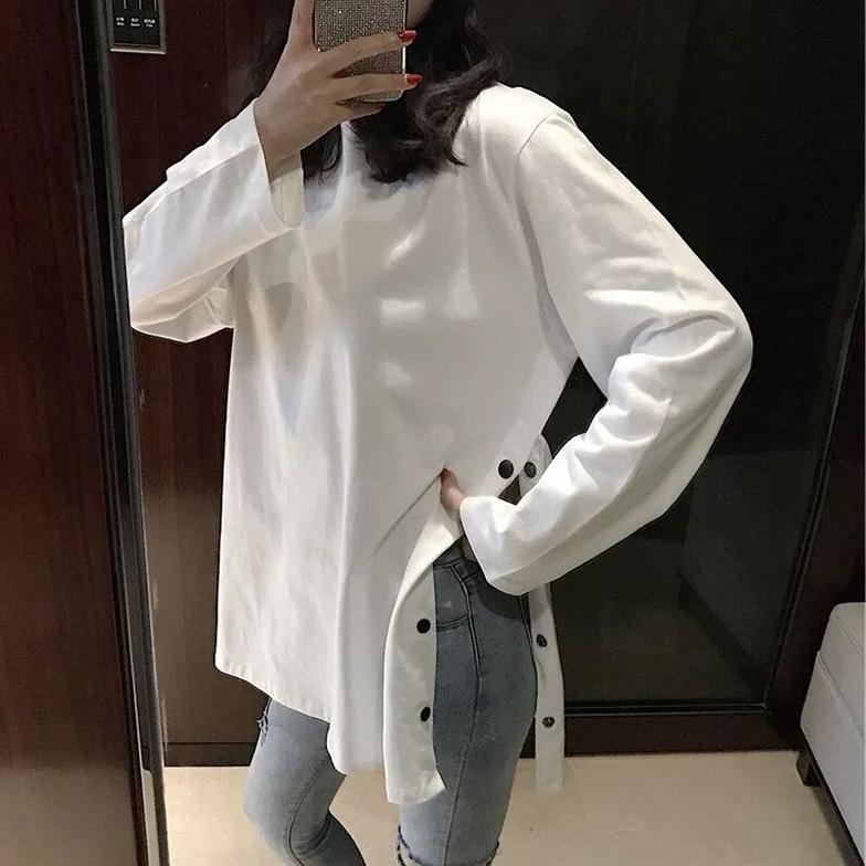 Весенняя белая и черная длинная футболка с разрезом на боковой пуговице, женские рубашки с круглым вырезом, осеннее поступление, однотонная футболка большого размера в стиле Харадзюку, топы