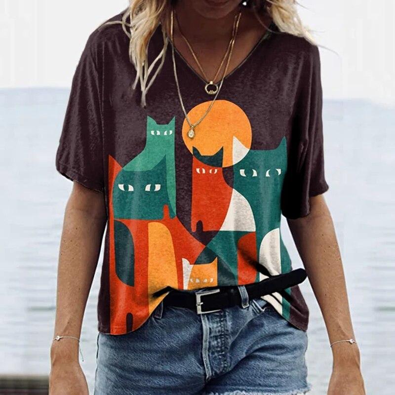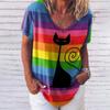 Лето 2022, женская футболка с коротким рукавом и v-образным вырезом, топы с кошачьим принтом, повседневная уличная одежда, свободная женская футболка, размер, готический топ 5XL