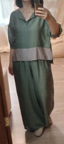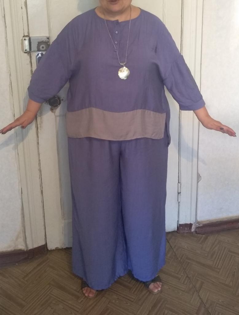 Моя фигура - груша (внизу больше, чем вверху) 120-110-140! Почти 100 кг веса. В размер 3Х вполне вписалась.Штаны: Имеются карманы. Длина от верхнего края резинки до низа 108 см (как в описании), длина по внутреннему шву 71 см. На мне это в пол на босу ногу. Размер талии, указанный в описании - это длина резинки. На моей талии (110) сидят комфортно: не давят, не болтаются. Ширина брюк внизу 42 см (половина) после разутюживания. Верх: ширина манжета около 35 см. Ширина блузы по обхвату груди, указанная в описании = ширине низа. Длина спереди короче, чем сзади (не достаёт до стратегического места, но выглядит неплохо). Ткань, даже после разутюживания, еле заметная жатка, лёгкая, струящаяся. Но можно и не гладить вовсе, в таком случае ткань будет плотнее, а ширина меньше. И последнее (дышит ткань или нет): после часа ходьбы таки вспотела, стали видны потемневшие пятна пота в местах близкого прилегания блузы к телу, но т.к. она очень свободная, то таких мест не много. Но, скорее всего, так было бы даже будь этот костюм из самой натуральной ткани, всё таки носить 100 кг не легко... Рукава, возможно, отрежу...