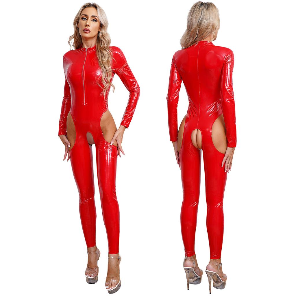 Женский цельный комбинезон с длинным рукавом для всего тела, кожаный комбинезон на молнии с мокрым эффектом, комбинезон