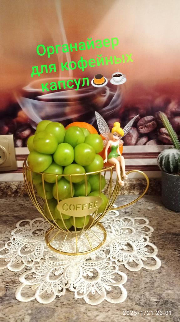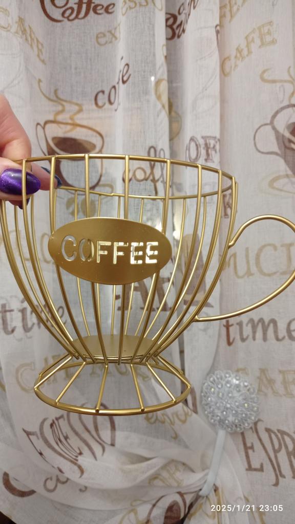 ☕Органайзер для хранения кофейных капсул, а также вазочка для хранения конфет, фруктов и других предметов! Цвет золотой👍! 🍮Я продолжила "кофейную тему" на своей любимой кухне! 😄Обожаю подобные вазочки💓💞💖‼️У меня есть подобная, только в чёрном цвете. Они здорово дополняют интерьер своим необычным видом👍‼️ ☕Обожаю кофе🍮☕😘 и поэтому у меня и кухня оформлена по этой теме, а когда увидела эту вазочку, сразу поняла, что она ,непременно, должна стоять на моём кухонном столе☝😉‼️ 🍮Вазочка классная 👍👍👍! ☕Материал : кованое железо. Очень лёгкая. Прекрасно сделана! Пришла в картонной коробке с пупыркой, не повреждена! Всё ровненько, аккуратно, без зазубрин, просто, идеальная👍💯‼️ 🍮По размеру совпадает с описанием! 🍮Очень мне она понравилась! Несмотря на маленький размер , довольно, вместительная!!! Вместилась большая ветка винограда🍇и пару мандаринок🍊, можно было и ещё что нибудь положить! 😉Конфетки🍬🍬🍬тоже хорошо смотрятся в этой вазочке💯💯💯 ☕Очень приятная покупка, я довольна!! 🥰🥰🥰💃💃💃😘😘😘!