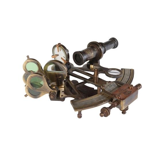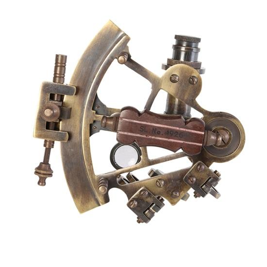 Античная патина на старинной латунной репродукции морского секстана.. Это известно как британский образец.. Секстант капитана морской пехоты Латунный секстант из цельной латуни Секстан для моря Секстант — это инструмент для измерения угла между двумя видимыми объектами.. Его основное применение — вычисление высоты, то есть угла между небесным объектом и горизонтом.. Это называется наблюдением объекта, стрельбой по объекту или прицеливанием.. Угол и время измерения можно использовать для расчета линии положения на морской или аэронавигационной карте.. Секстант обычно используется для определения широты по наблюдению солнца в полдень..