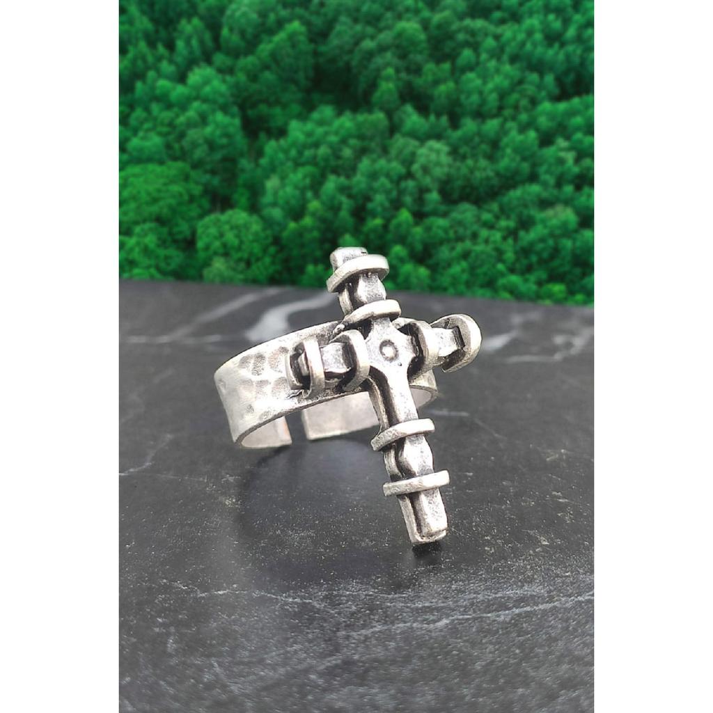 Регулируемое кольцо с антикварным крестом и веревкой, матовое посеребрение