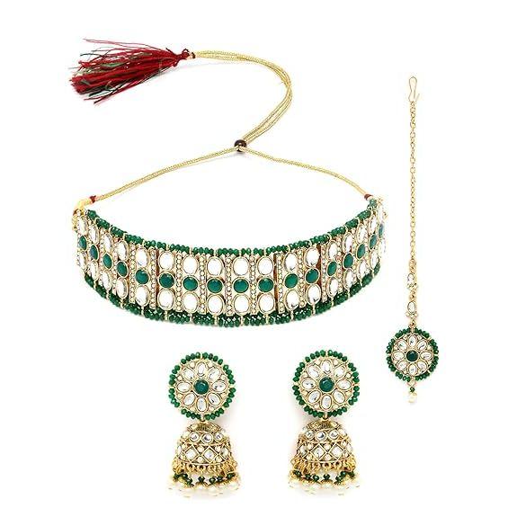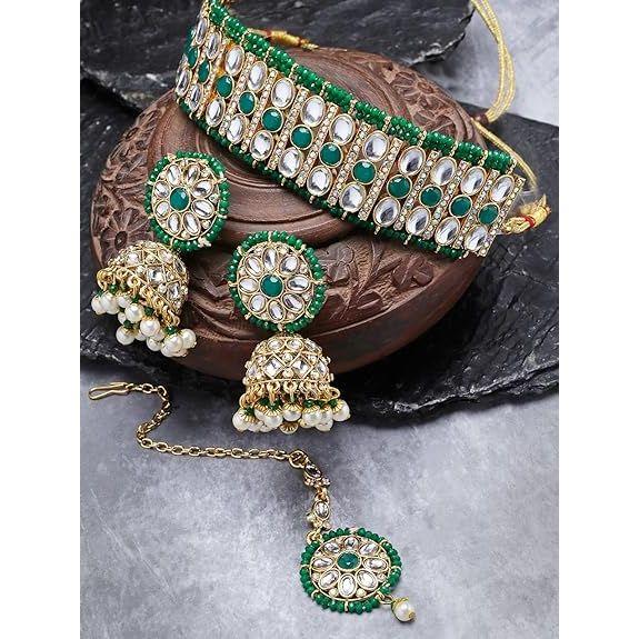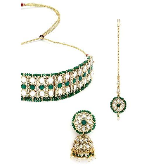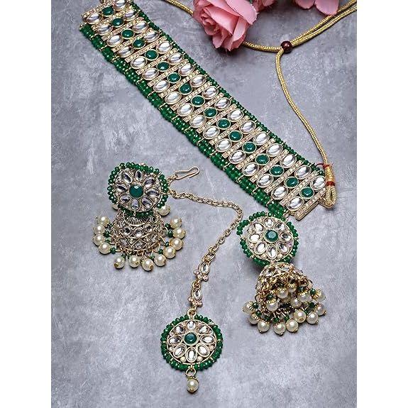 Спортивный зеленый кундан и бусы: Комплект ювелирных украшений Sporty Gold Plated с яркими зелеными камнями и бусинами Kundan создает спортивный и энергичный образ, дополняющий ваш динамичный стиль.