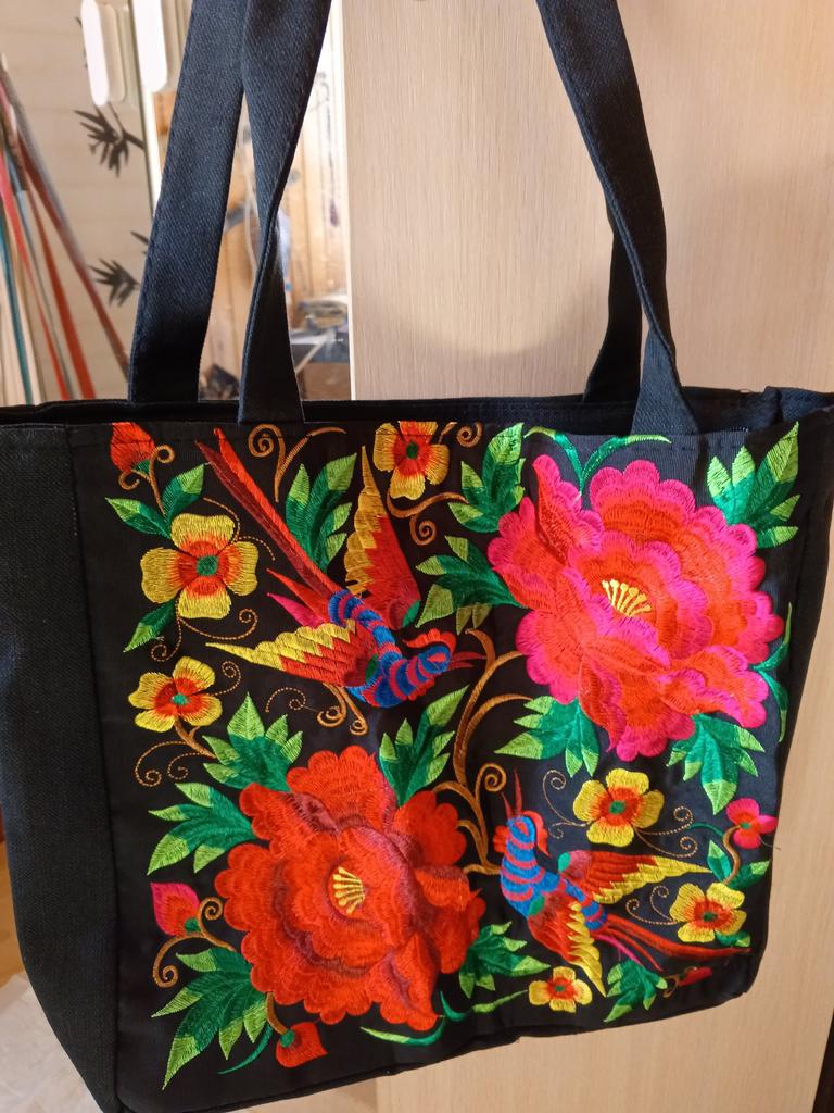 Сумка-шоппер в этно-стиле с красивущей вышивкой. Размер внушительный, соответствует заявленному у продавца. Вышивка качественная, яркая. Обратная сторона однотонная, без декора. Покупала для использования ее в кантри образах. P.S. Укоротила на сумке ручки, слишком длинные. Подпорола с одной стороны, протолкнула ручки поглубже вовнутрь и плотно зашила сверху. Теперь отлично! Ношу и радуюсь, сумка очень обращает на себя внимание.