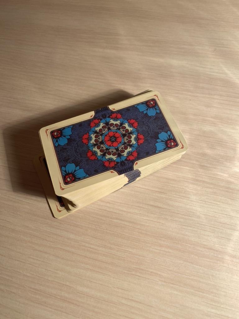 огонь колода, покупка оказалась спонтанной но не зря! карты яркие чёткие но тоненькие и в правом верхнем углу есть небольшая мятина, на некоторых картах мятина в этом месте тоже имеется (( ну в целом не критично, карты как по маслу тасуются приятно. а ещё по размеру они не большие, типичная мини версия китайцев. ну ничего за такие деньги ожидаемо! можно рекомендовать, колода говорящая и идёт на серьёзные вопросы, в чем-то покруче уэйта.