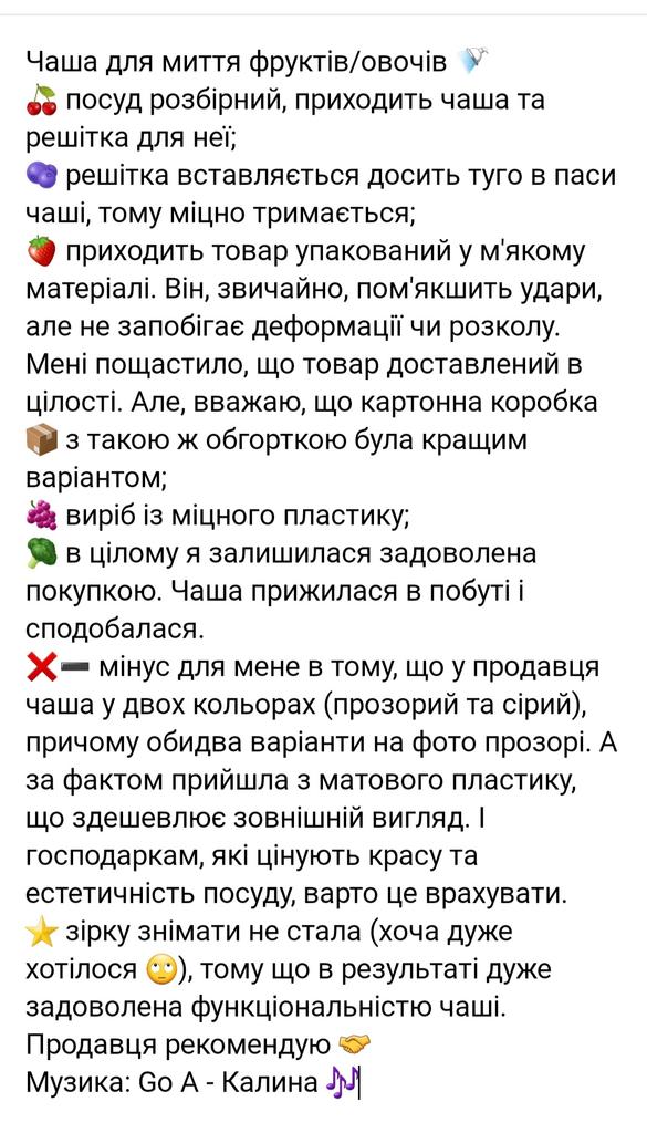 Чаша для мытья фруктов/овощей 🚿 🍒 посуда разборная, приходит чаша и решётка для неё; 🫐 решётка вставляется довольно туго в пасы чаши, поэтому крепко держится; 🍓 приходит товар упакован в мягком материале. Он, конечно, смягчит удары, но не предотвратит деформацию или раскол. Мне повезло, что товар доставлен в целости. Но, считаю, что картонная коробка 📦 с такой же обёрткой была куда лучшим вариантом; 🍇 изделие из прочного пластика; 🥦 вцелом я осталась довольна покупкой. Чаша прижилась в обиходе и понравилась. ❌➖ минус для меня в том, что у продавца чаша в двух цветах (прозрачный и серый), причём оба варианта на фото прозрачные. А по факту пришла из матового пластика, что удешевляет внешний вид. И хозяйкам, ценящим красоту и эстетичность посуды, стоит это учесть. ⭐ звезду снимать не стала(хотя очень хотелось 🙄), так как в итоге очень довольна самой функциональностью чаши. Продавца рекомендую 🤝 Музыка: Go A - Калина 🎶