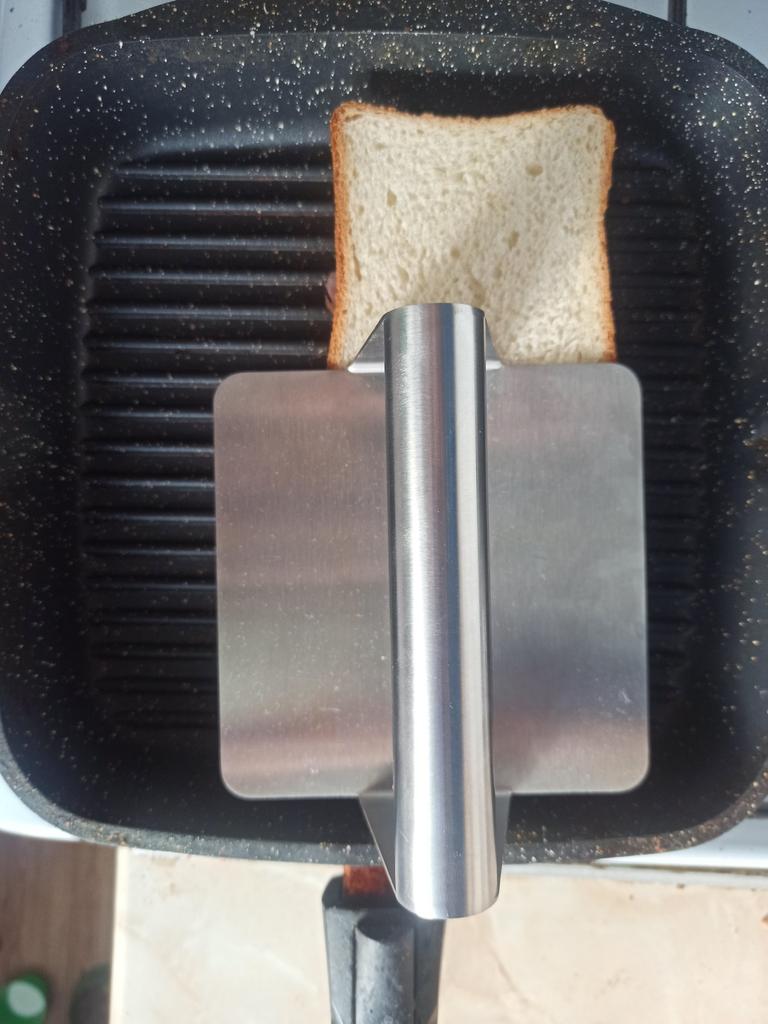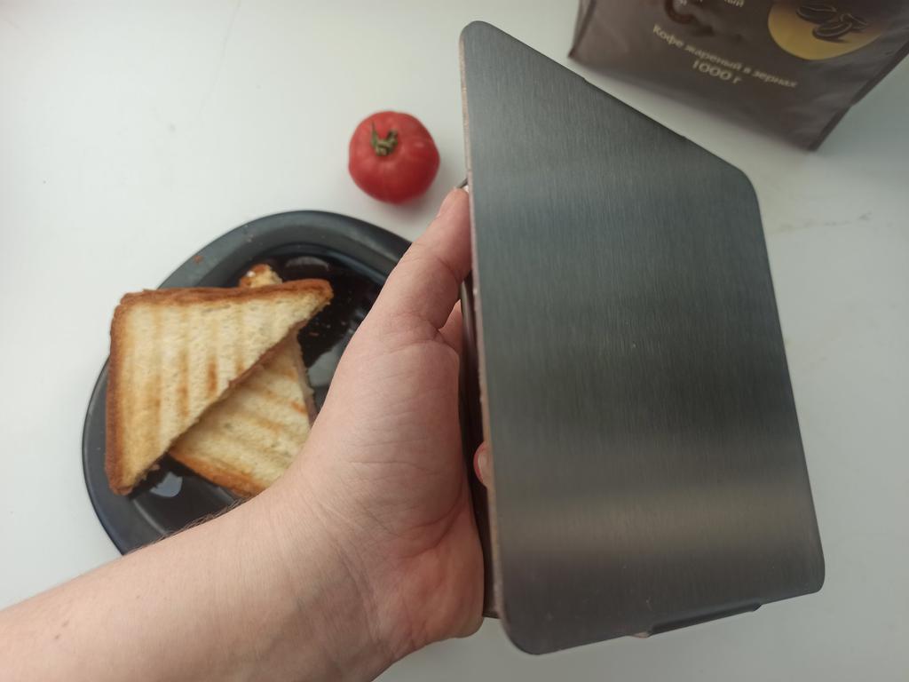 Суперский пресс. Опробовала на горячих бутербродах, стейках. Он реально хорош. У меня сковорода - гриль квадратная, поэтому и форму взяла соответствующую. Тяжелый, удобная ручка, большая, площадь. Никакого риска обжечься, да и удобнее прижимать, чем лопаткой. Приходит в коробке, упакован надежно. Нужная штука для кухни 👍