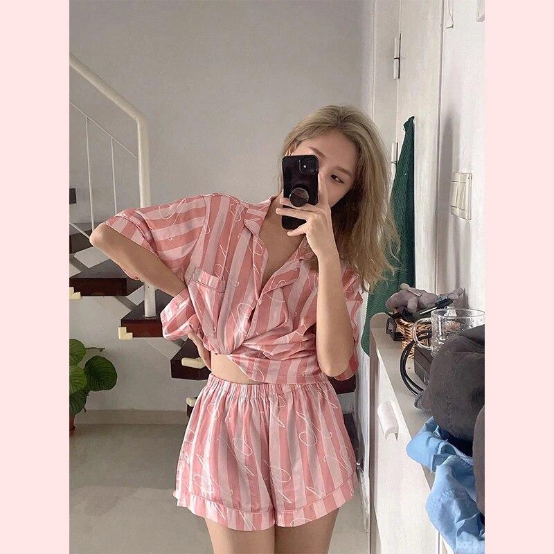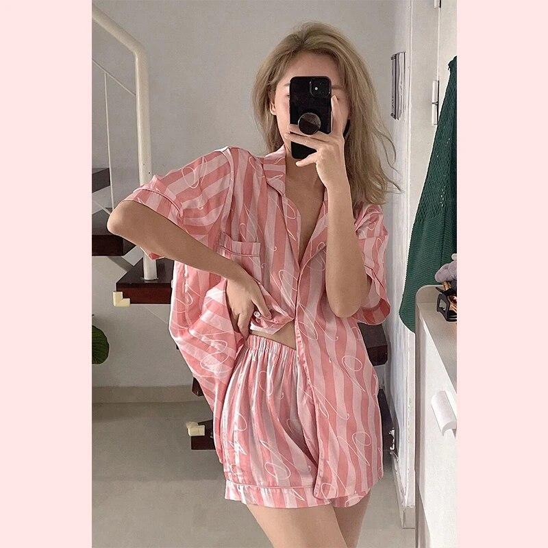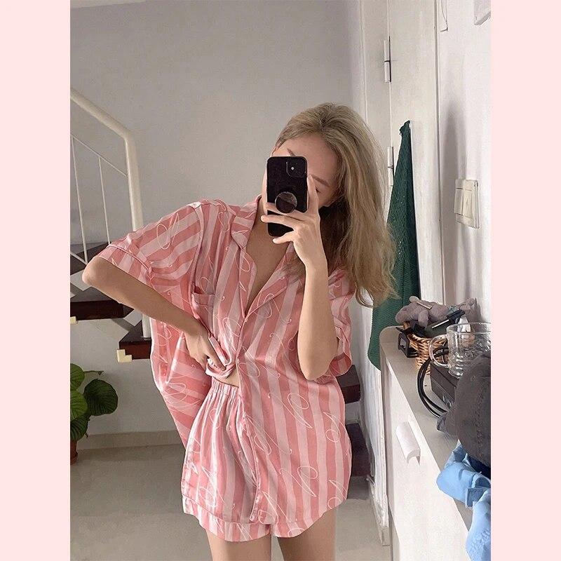 Летние женские пижамные комплекты в розовую полоску с мягкими пуговицами, пижамы из искусственного шелка, одежда для сна, рубашка с короткими рукавами и брюки, домашняя одежда с шелковыми пятнами