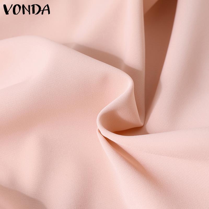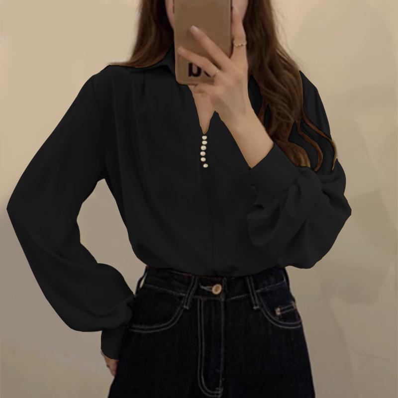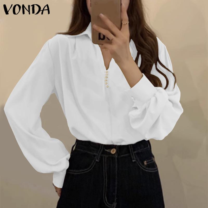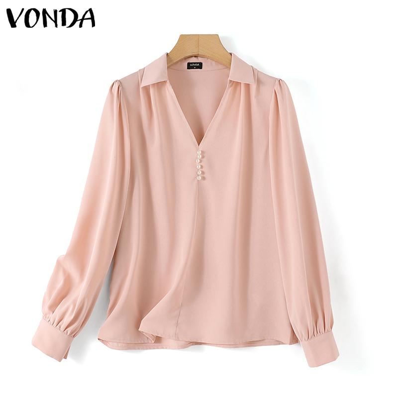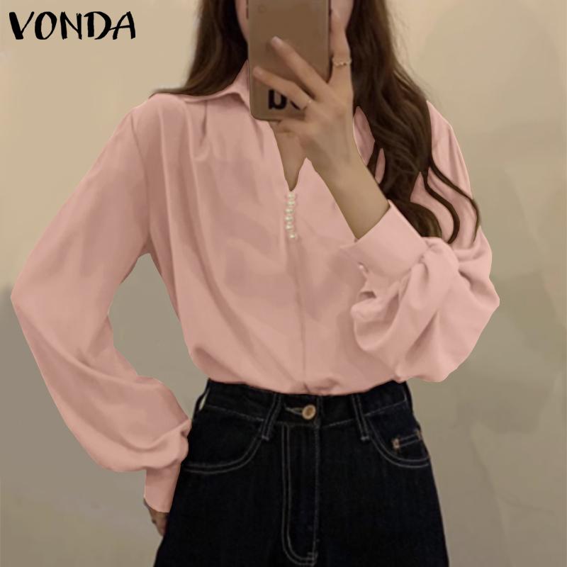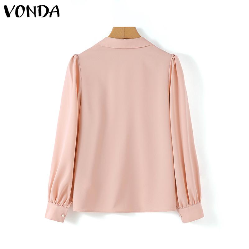 VONDA Женская рубашка с пышным воротником и длинным рукавом, украшенная жемчугом, однотонный свободный топ