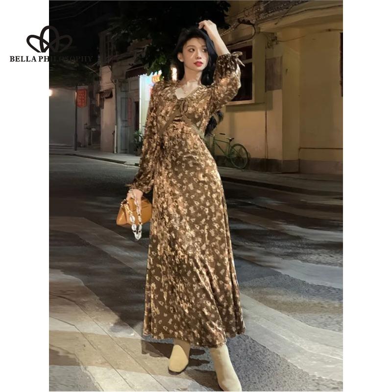 Винтажное платье в нежном стиле с принтом во французском стиле, длинное платье с длинными рукавами и шнуровкой, бархатное платье, шикарное облегающее платье с v-образным вырезом и цветочным принтом