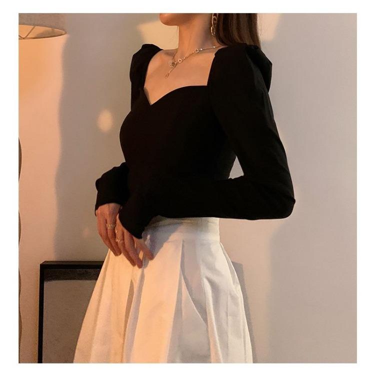 Черная блузка в винтажном французском стиле с объемными рукавами и элегантным дизайном для женщин