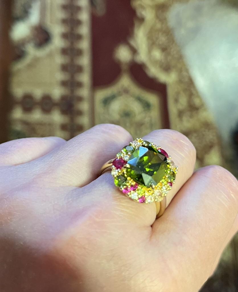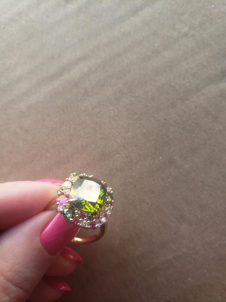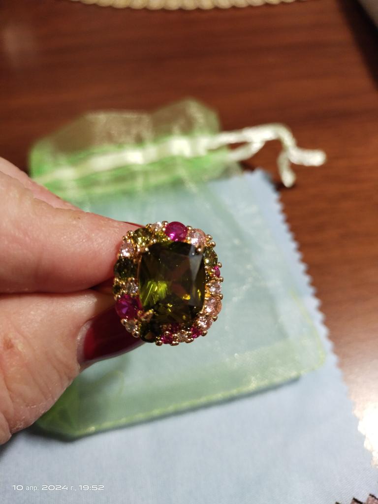 Кольцо, немного, разочаровало... Блестит, переливается, размер подошёл. Но... Цвет крупного камня не такой, как на образце. Болотного цвета. Камушки, обрамляющие центральный камень, расположены не симметрично по цвету. 😔 Порадовала упаковка в мешочек и тряпочка для протирки ювелирных изделий.