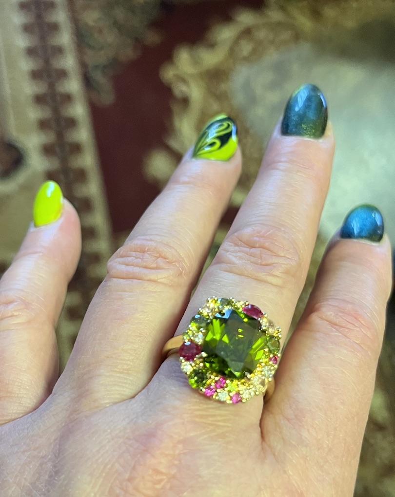 Кольцо красивое. Но его цвет абсолютно не соответствует фото в описании товара! И дело не в освещении. На фото просто другое кольцо. В реальности цвет не темно-зеленый, а яркий, оливковый. Камни не розовые, а ярко-малиновые. Такое я покупала на Али экспресс и фото полностью соответствовало. Здесь я купила в надежде, что это именно темный цвет! Придется дарить…