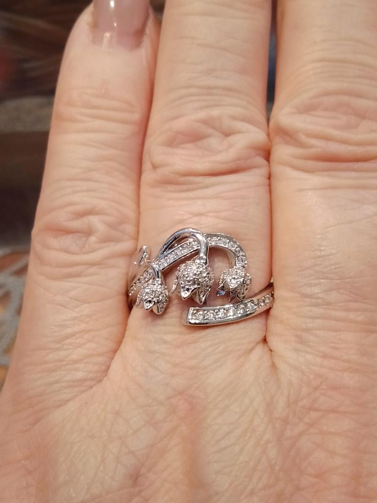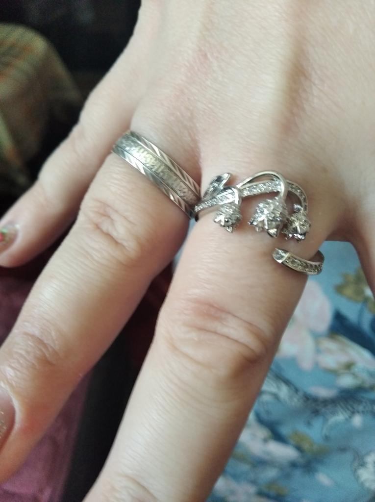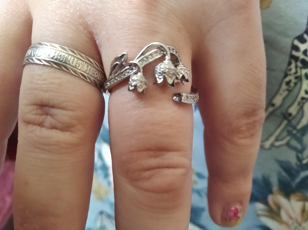 Разъемное кольцо на 17-18 размер в виде ландышей. Выполнено аккуратно. Но в реальности в дизайне много страз и нежность переходит в дешевизну. Хотя кому как.