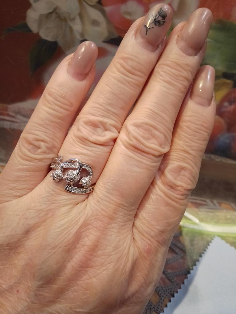 Ну до чего же красивое колечко. Дизайн выполнен в виде веточки ландыша с тремя цветочками. Маленькие циркончики так и переливаются на свету. Главное безразмерное. Можно на любой палец одеть. Только бы металл не потускнел. Покупкой осталась довольна.