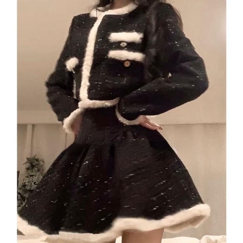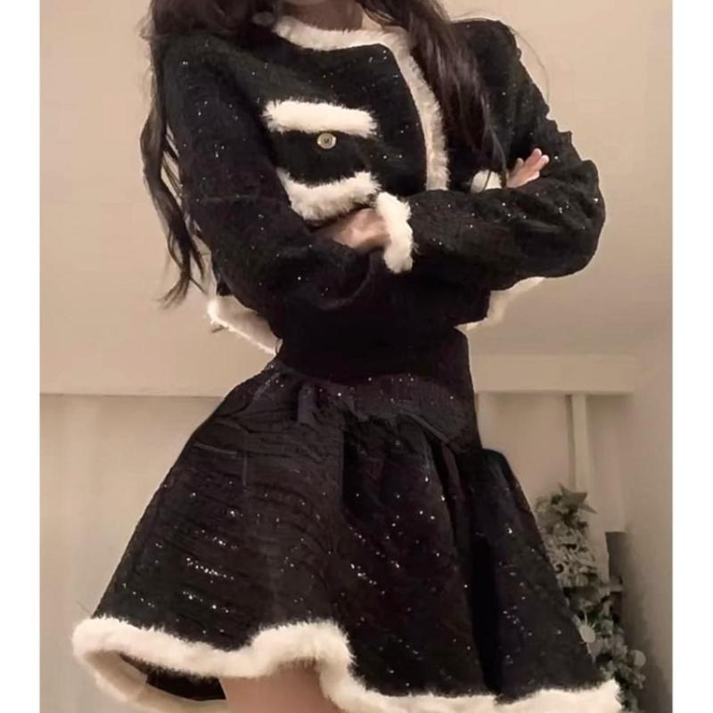 Винтажный черный комплект из 2 предметов, юбка, женская осенняя теплая кавайная укороченная верхняя одежда, элегантная тонкая мини-юбка, вечерние корейская модная одежда 2024