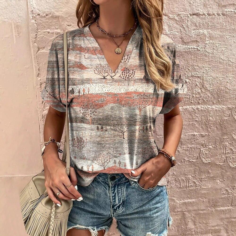 Женская футболка в стиле ретро, летняя футболка с коротким рукавом и v-образным вырезом, повседневная футболка в полоску с принтом в стиле Харадзюку для женщин, уличная одежда, пуловеры, новые топы