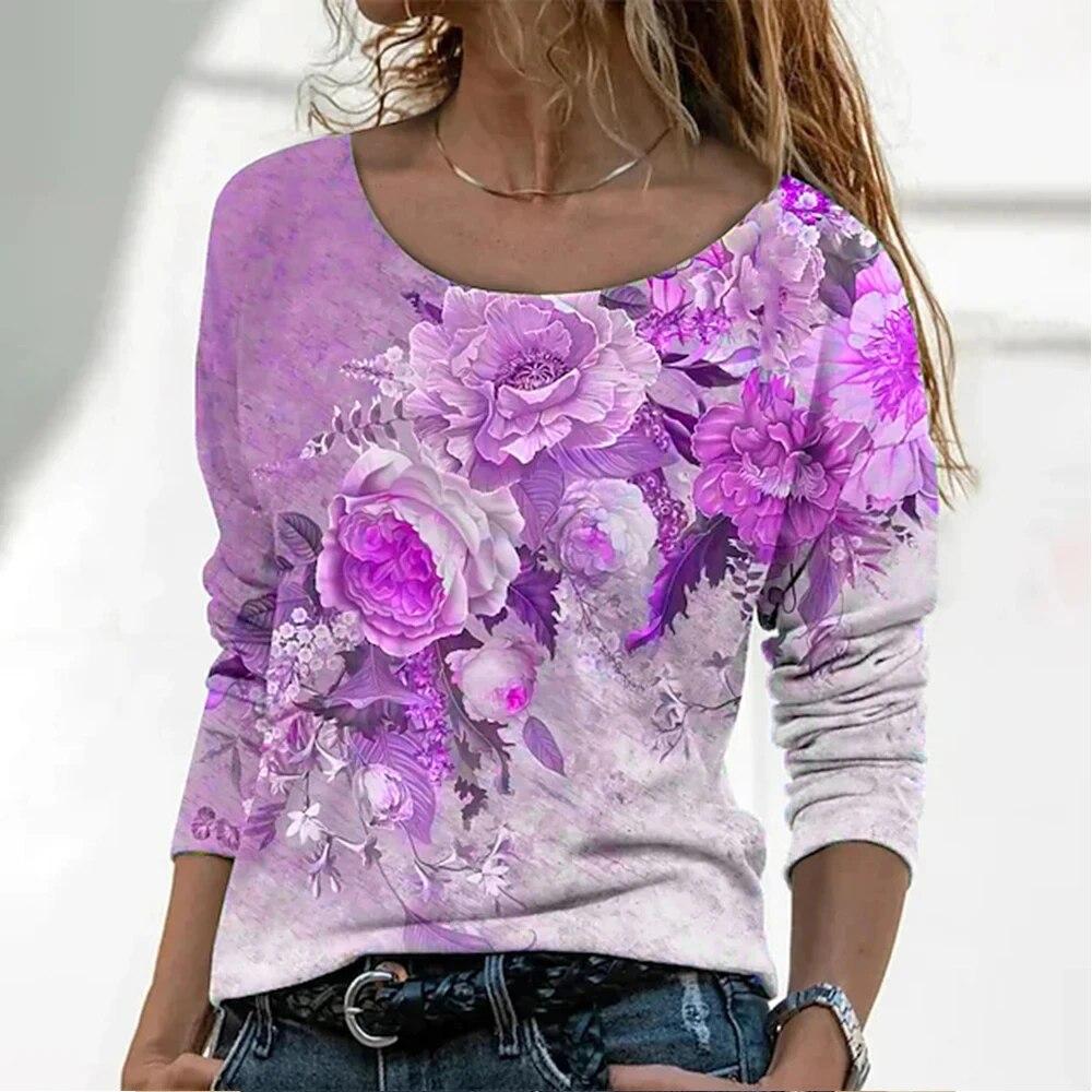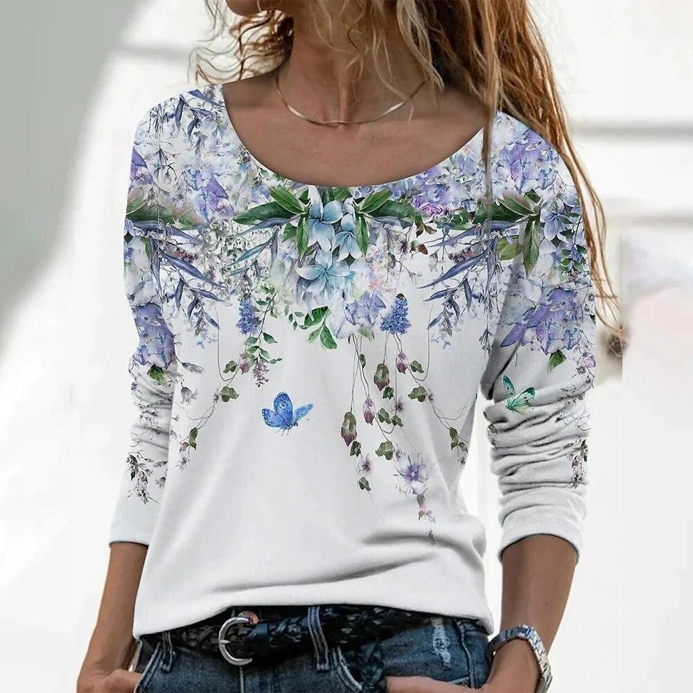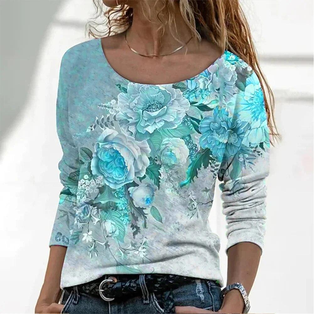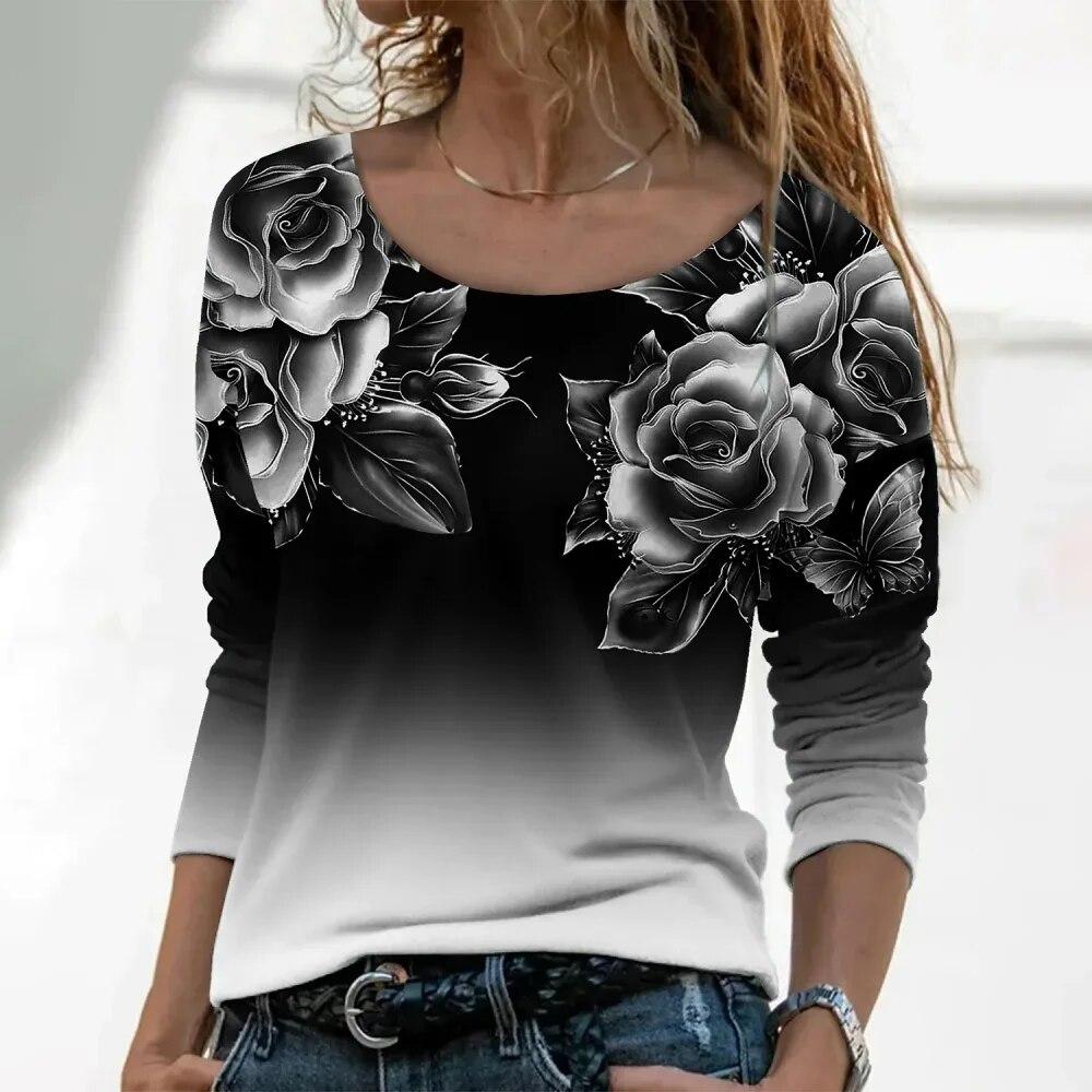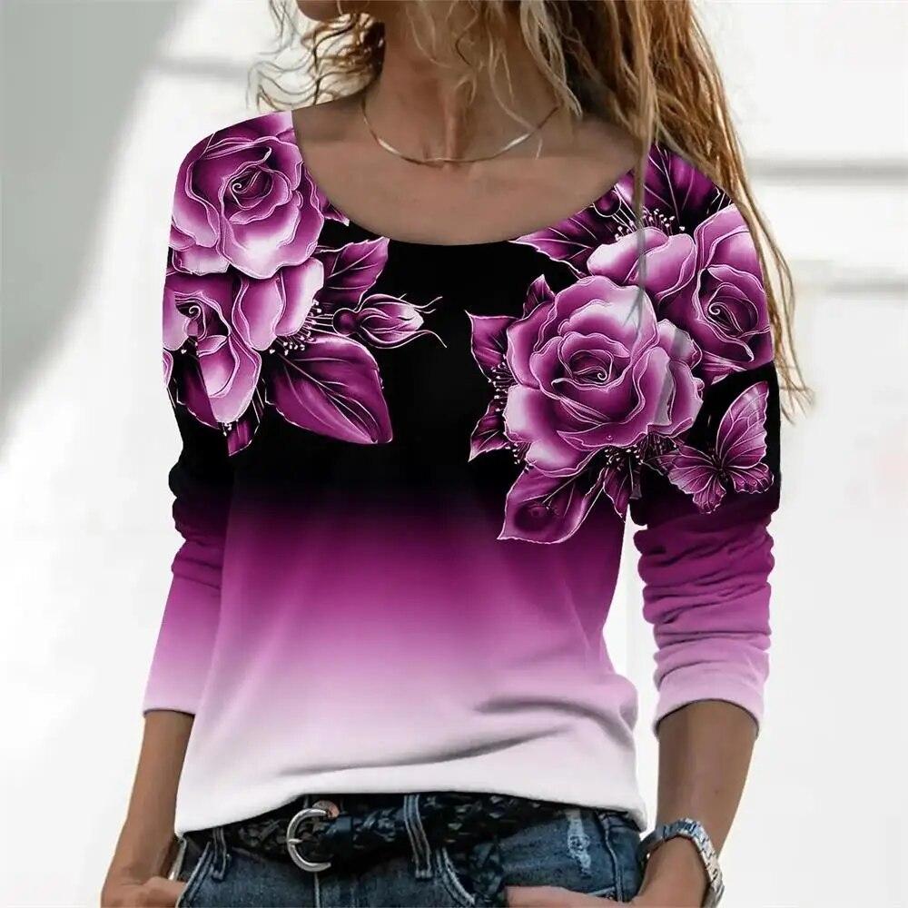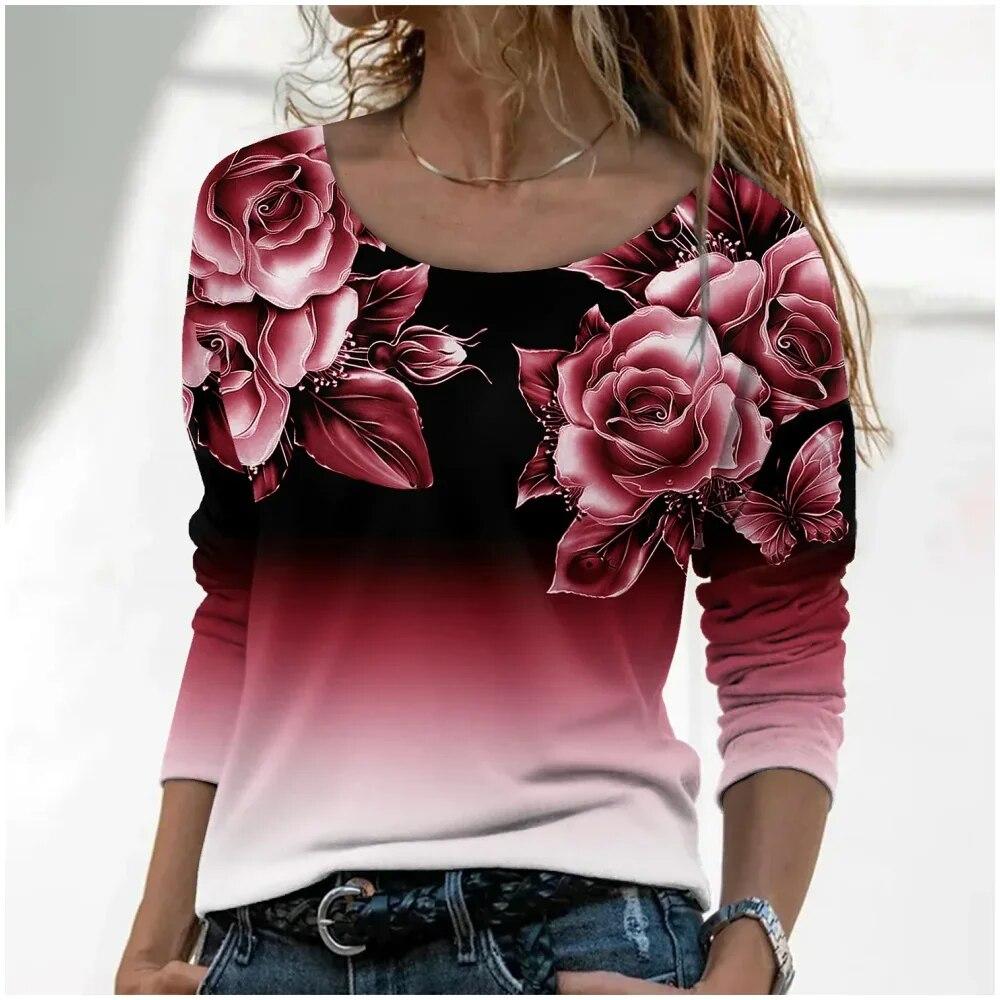 Модная женская футболка с градиентным цветочным принтом, топ большого размера, футболки с длинными рукавами в стиле Харадзюку, уличный великолепный женский пуловер с v-образным вырезом
