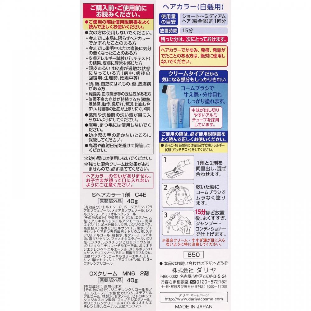 Ингредиенты/Дозировка: Указанные ингредиенты ○S Краска для волос C1, агент 4E <Активные ингредиенты>Толуол-2,5-диамин, парааминофенол, метаминофенол, резорцин, 5-аминоортокрезол <Другие ингредиенты>сульфит натрия, этанол, хлорид алкилтриметиламмония, экстракт морских водорослей (1), (гидролизованный шелк/PG-пропилметилсиландиол) кроссполимер, гидролизованный шелковый жидкий экстракт, экстракт солодки, высокая полимеризация Метилполисилоксан (1), стоячая вода, раствор пентанатрия диэтилентриамина пентауксусной кислоты, стеариловый спирт, вода очищенная, цетанол, масло камелии, концентрированный глицерин, феноксиэтанол, раствор полидиметилдиметиленпирролидиния, полиоксиэтиленцетиловый эфир, полиоксиэтиленбегениловый эфир, метилполисилоксан, моноэтаноламин, жидкий парафин, экстракт маточного молочка, DL- яблочная кислота Натрий, L-аскорбиновая кислота, 1,3-бутиленгликоль ○OX крем MN62 агент <активные ингредиенты>перекись водорода <другие ингредиенты>моноэтиловый эфир диэтиленгликоля, гидроксид калия, стеариловый спирт, очищенная вода, цетанол, раствор гидроксиэтандифосфоновой кислоты, феноксиэтанол, полиэтиленгликоль 400, полиоксиэтиленцетиловый эфир, жидкий парафин