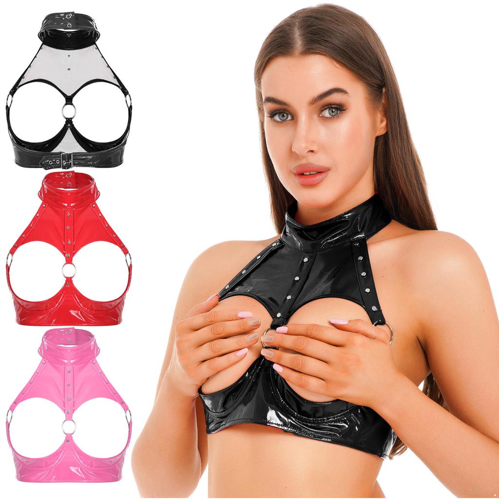 Женский бюстгальтер на косточках с открытой чашкой, укороченный топ, модный жилет с заклепками и уплотнительным кольцом, жилет с открытой спиной, топы из лакированной кожи с мокрым эффектом, клубная одежда — купить товар онлайн с бесплатной доставкой по всему миру!