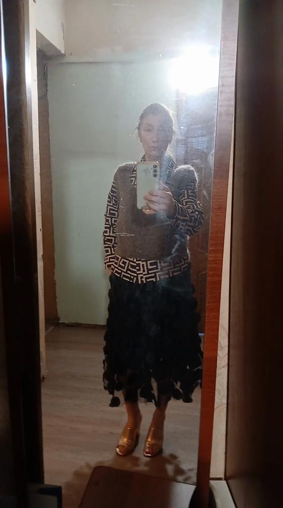 Размер подошёл. Но я бы взяла на размер меньше, т.к. это должно "сидеть" по другому. Конечно это не Fendi, но соотношение цены и качества пойдет. Хотелось бы, чтобы ткань была другого качества-лучше, ближе к натуральному шёлку. Но ждать от Джума изделий ближе к оригиналу не стоит. Поэтому я ставлю 3 звезды. Фото добавлю чуть позже. Сегодня 26.11.2025. Связала безрукавку (остался немного мохера). Решила примерить с кофтой и юбкой, тоже купленной на джуме. Мне больше так нравится образ с жилеткой. Лучше сочетается., чем просто юбка с этой кофтой. Ещё раз хочу сказать, что блузка на всех домах сидела бы отлично, если бы это был атласный шёлк и цвет насыщенее.