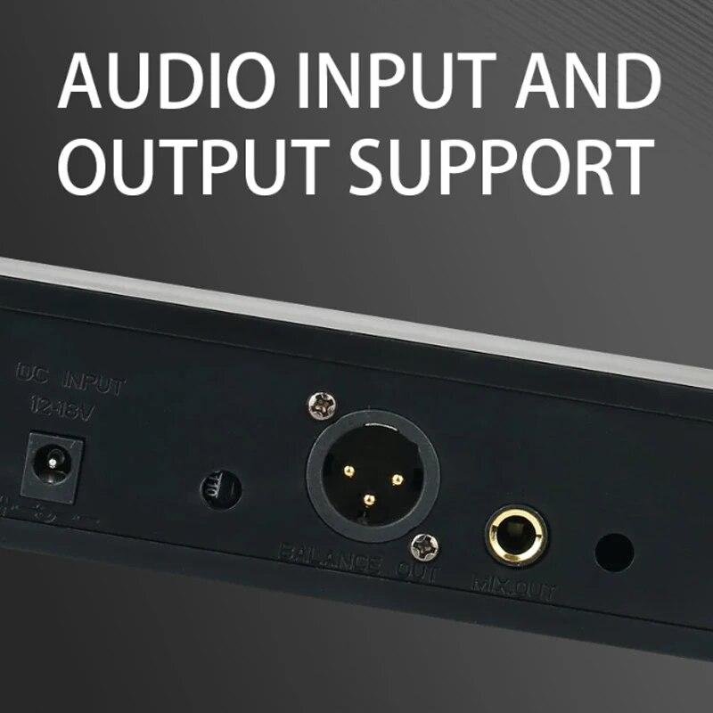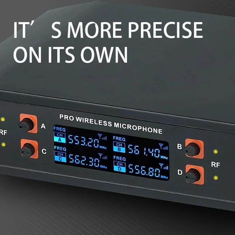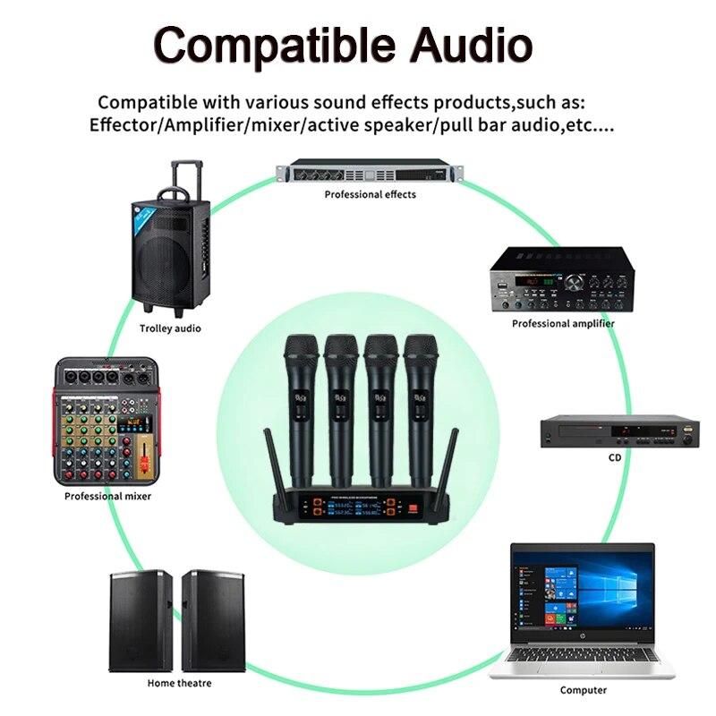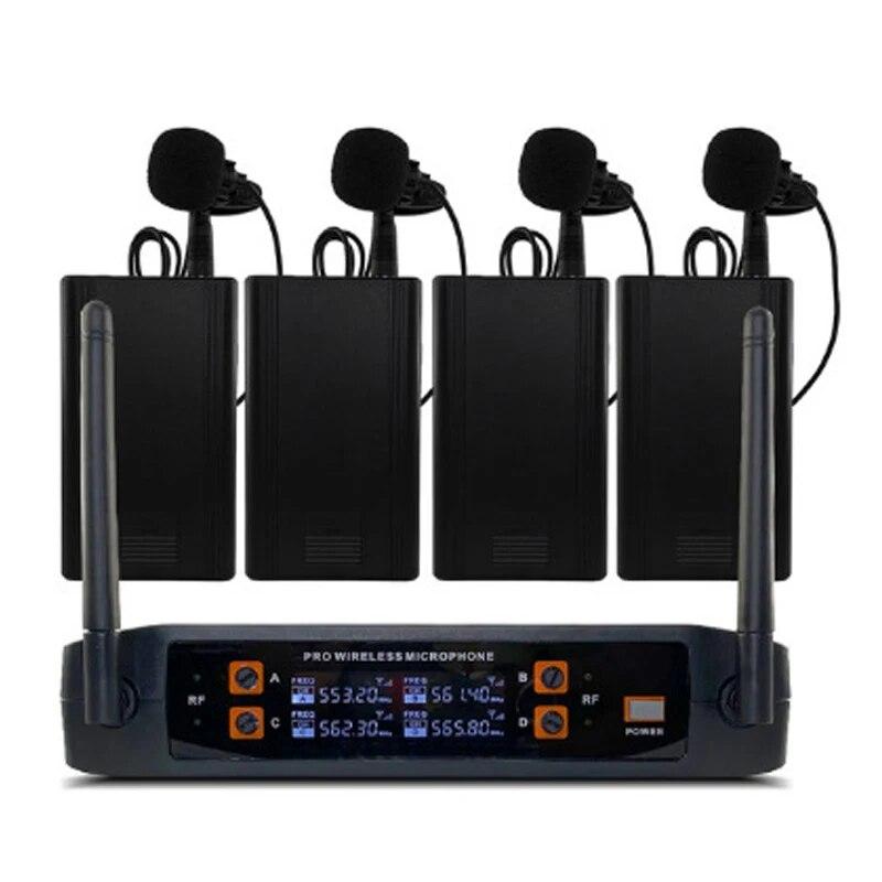 * 4-канальная беспроводная микрофонная система: Беспроводная микрофонная система обеспечивает 4 независимых канала, каждый канал оснащен специальным микрофоном и приемной коробкой с независимым регулятором громкости. Система также оснащена автоматическим частотным сканированием и автоматической настройкой передатчика для легкой синхронизации между передатчиком и приемником.