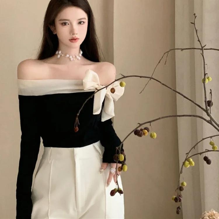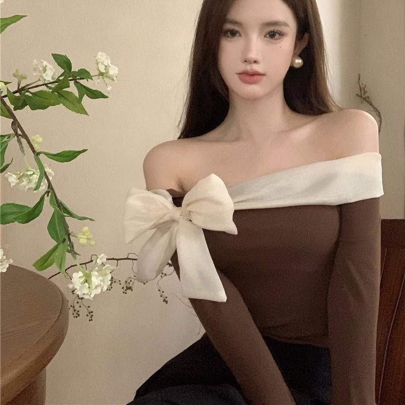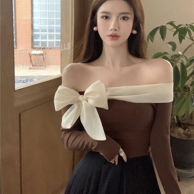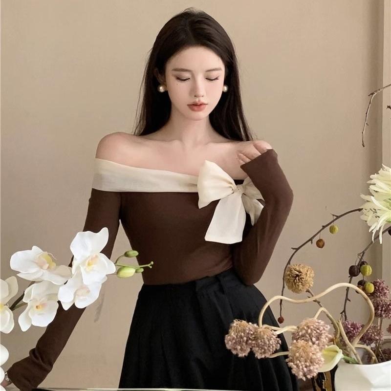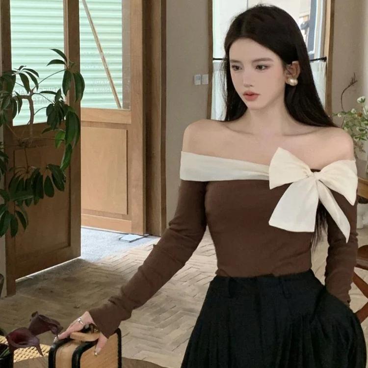 Кокетка с открытыми плечами, черные футболки, женские корейские стильные шикарные коричневые футболки с длинными рукавами с бантом, милые сексуальные лоскутные узкие топы