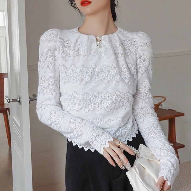 Модная вязаная крючком кружевная блузка для женщин, простые плиссированные топы с длинными рукавами, осень-зима, повседневная корейская полая рубашка 29562 — купить товар онлайн с бесплатной доставкой до всему миру!