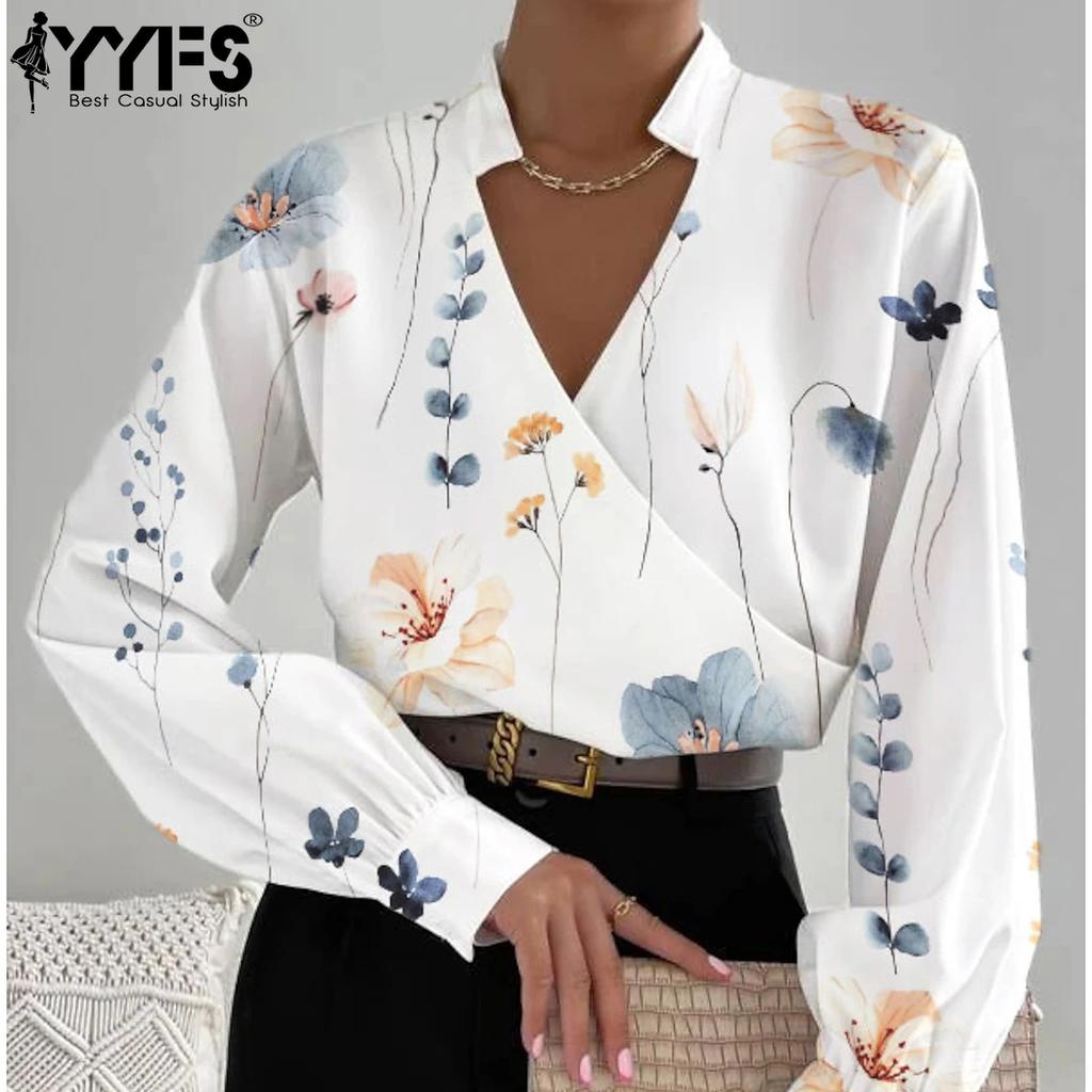 YYFS Женские модные повседневные весенне-осенние блузки и рубашки с v-образным вырезом и длинным рукавом с цветочным узором и принтом