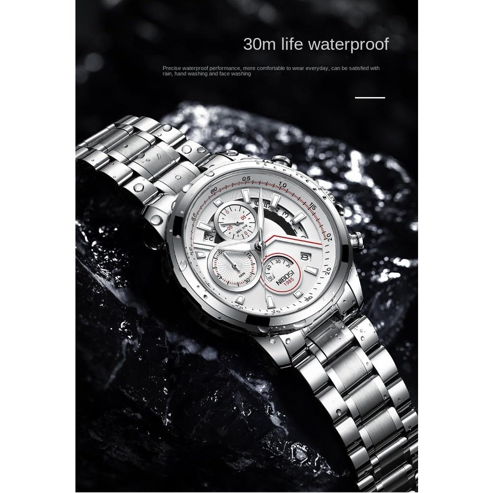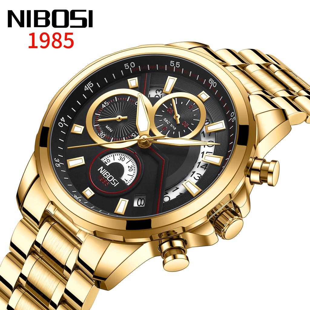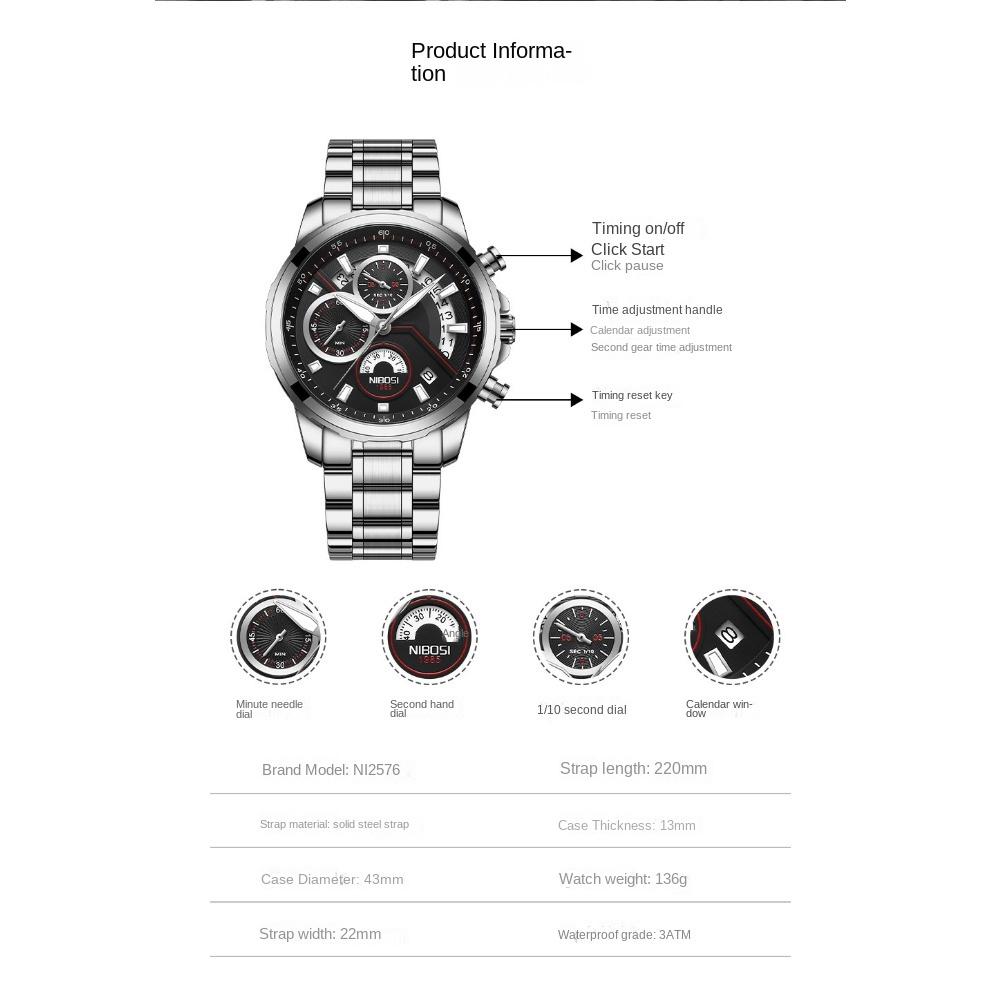 NIBOSI Мужские часы из твердой стали с левыми 3 глазами, 6 иглами, многофункциональные кварцевые часы, светящиеся, водонепроницаемые