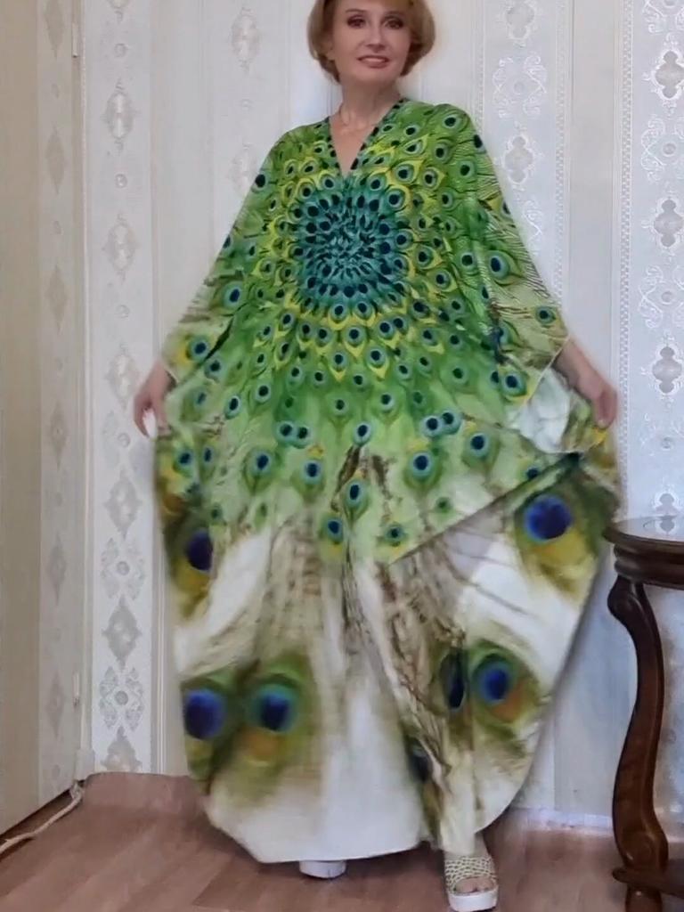 Пляжная туника Edolynsa с принтом в виде раскрытого хвоста павлина Туника выполнена из мягкого и нежного на ощупь полиэстера, который по ощущениям напоминает вискозу. Она состоит из двух полотен, простроченных в области плеч и по бокам. Имеет треугольный вырез и привлекательную ромбовидную накладку под грудью. Такой крой не сковывает движения, позволяя свободно двигаться на пляже. На мои параметры 84x63x89, рост 150 см, длина в пол. Она очень просторная, но при этом не выглядит мешковато, а наоборот, очень элегантно и воздушно. Туника красиво струится по телу. Ширина туники в плечах 118 см, обхват груди и бёдер 146 см, длина 132 см. Я очень довольна своей покупкой, она станет отличным дополнением к пляжному гардеробу. Личный промокод на скидку 5% на любые товары joom: 0DKZFI4MM4.