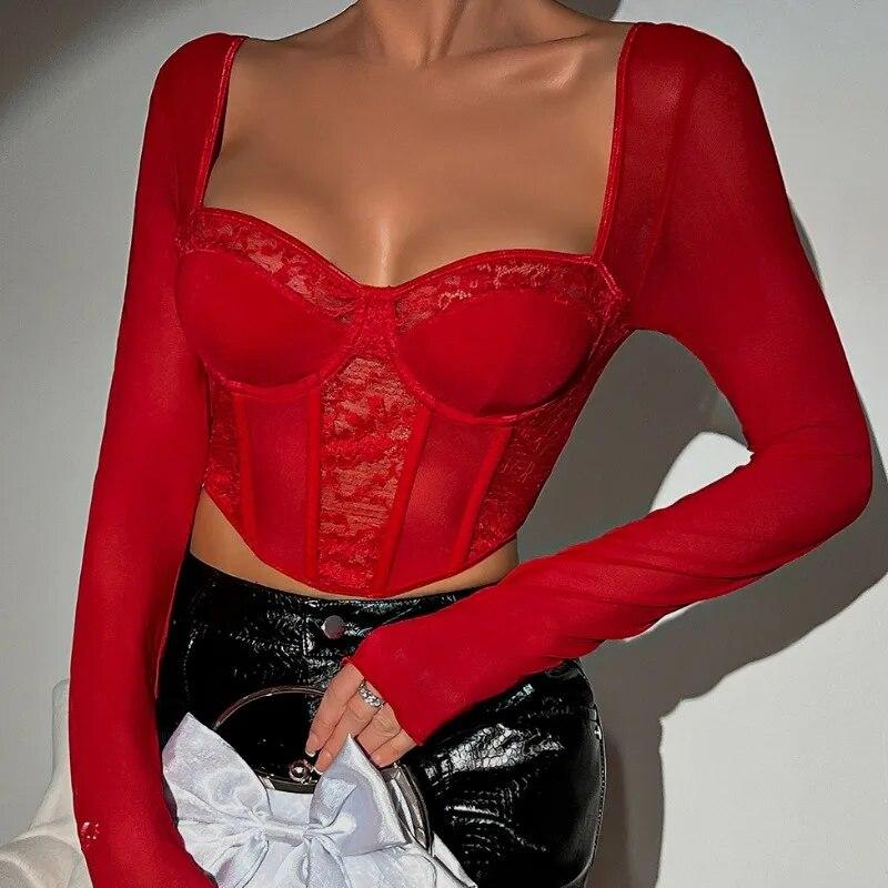 Уличная мода, кружевные сетчатые сексуальные укороченные топы, женские Y2K, облегающая блузка с квадратным вырезом, элегантные женские рубашки с длинным рукавом 30588