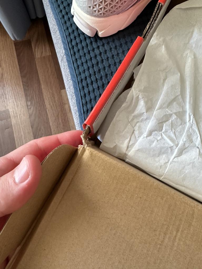 Заказ шел ровно месяц. Коробка кроссовок порвана и помята, хотя была доп упаковка из картона, не приятно. По поводу кроссовок, вроде бы все хорошо, но очень смущает едкий химозный запах как от дешевых кроссовок с рынка.
