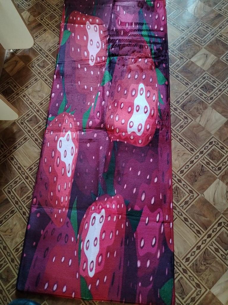 Коврик пришёл быстро. Он яркий, мягкий, приятный ногам. По полу не скользит. Спасибо Джум и продавцу.