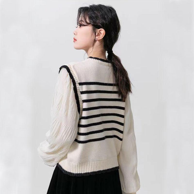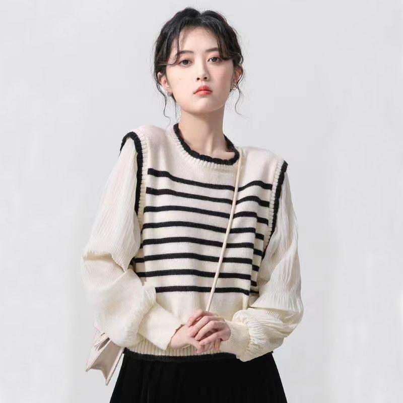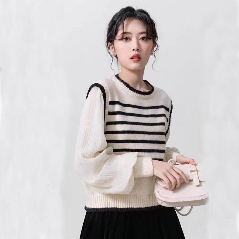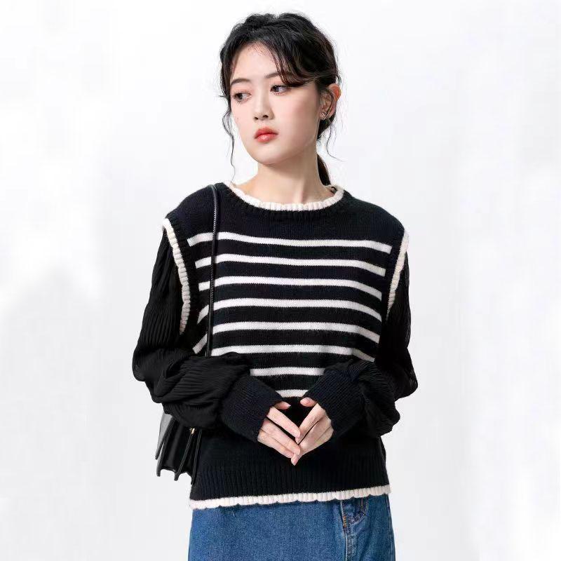 Французский вязаный свитер для женщин на весну и осень, новая нежная лоскутная рубашка контрастного цвета, полосатый верх-свитер.