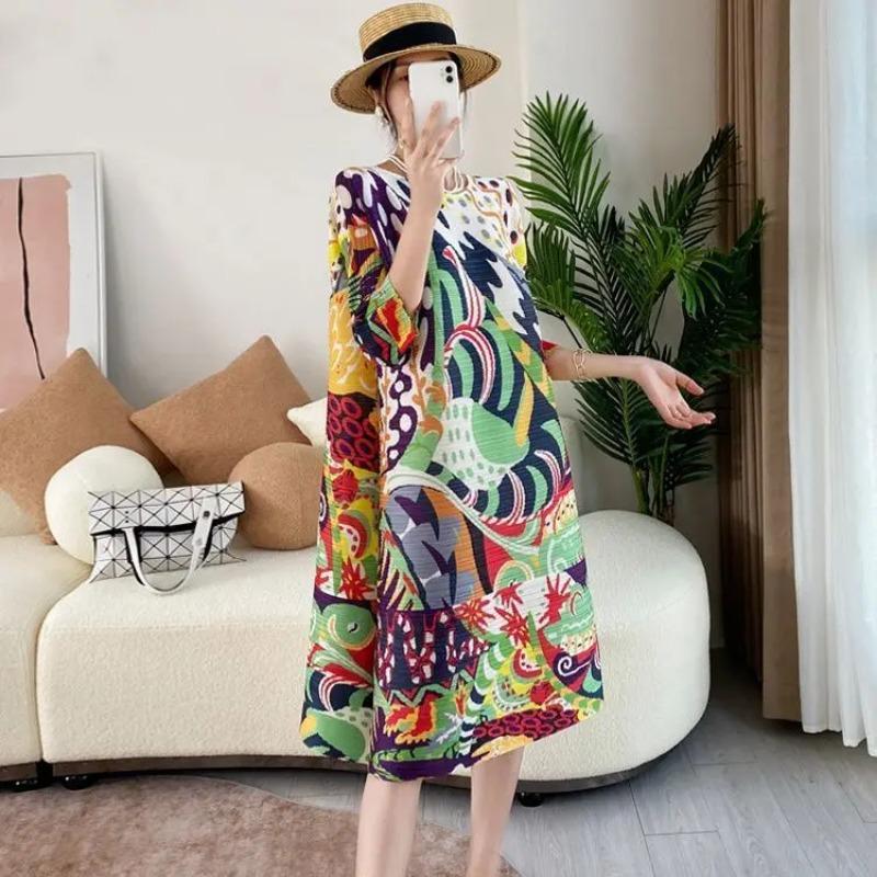 Темпераментное свободное платье в отпускном стиле с принтом для женщин, весна и осень, новая плиссированная юбка с круглым вырезом и рукавами четверти — купить товар онлайн с бесплатной доставкой по всему миру!